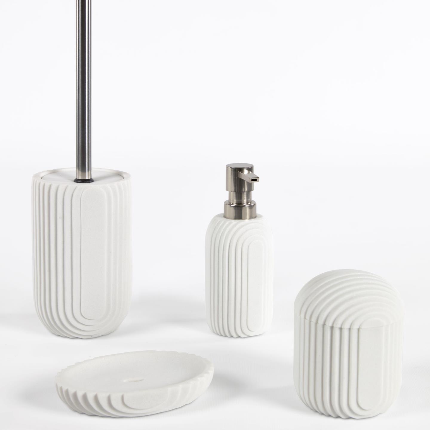 Набор аксессуаров для ванной Ateneas идеально впишется в любой дизайн ванной комнаты, благодаря своему цвету и лаконичному дизайну. Универсальный белый в сочетании с фактурными гранями – это беспроигрышный вариант для гармоничного акцента в современном интерьере. А практичный полирезин не потребует особых условий при использовании. Красота может быть простой и практичной!