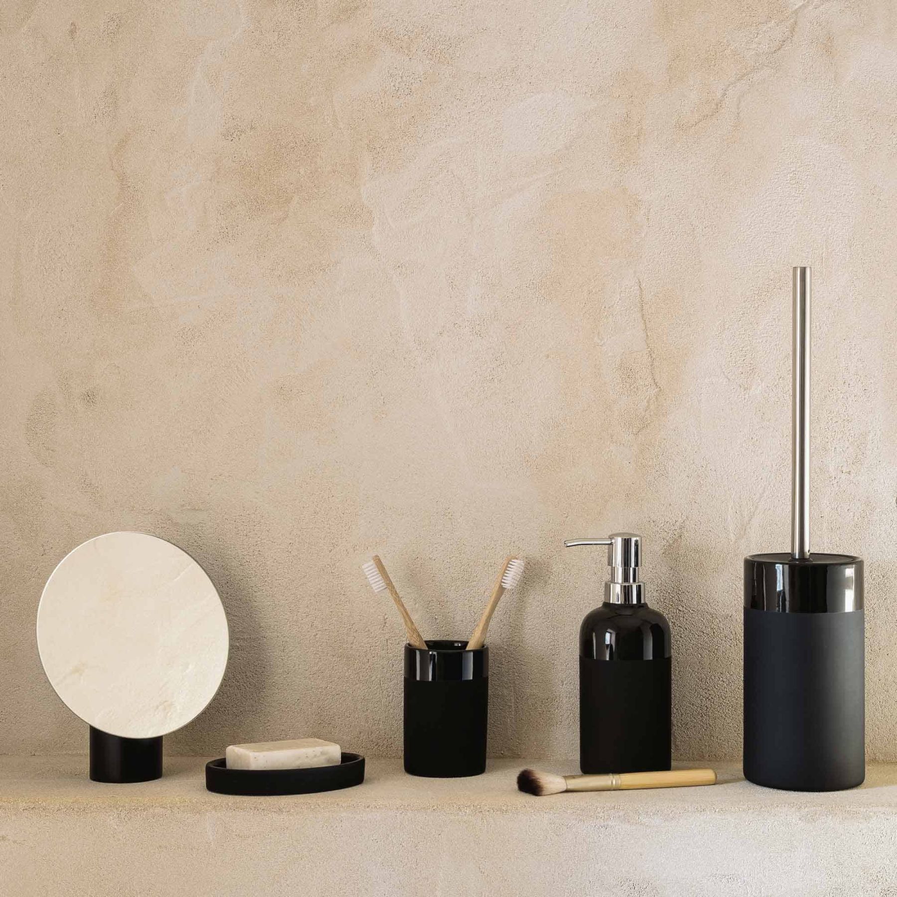 Коллекция состоит из пяти предметов: щетки, дозатора, мыльницы, стакана для зубных щеток, зеркала.