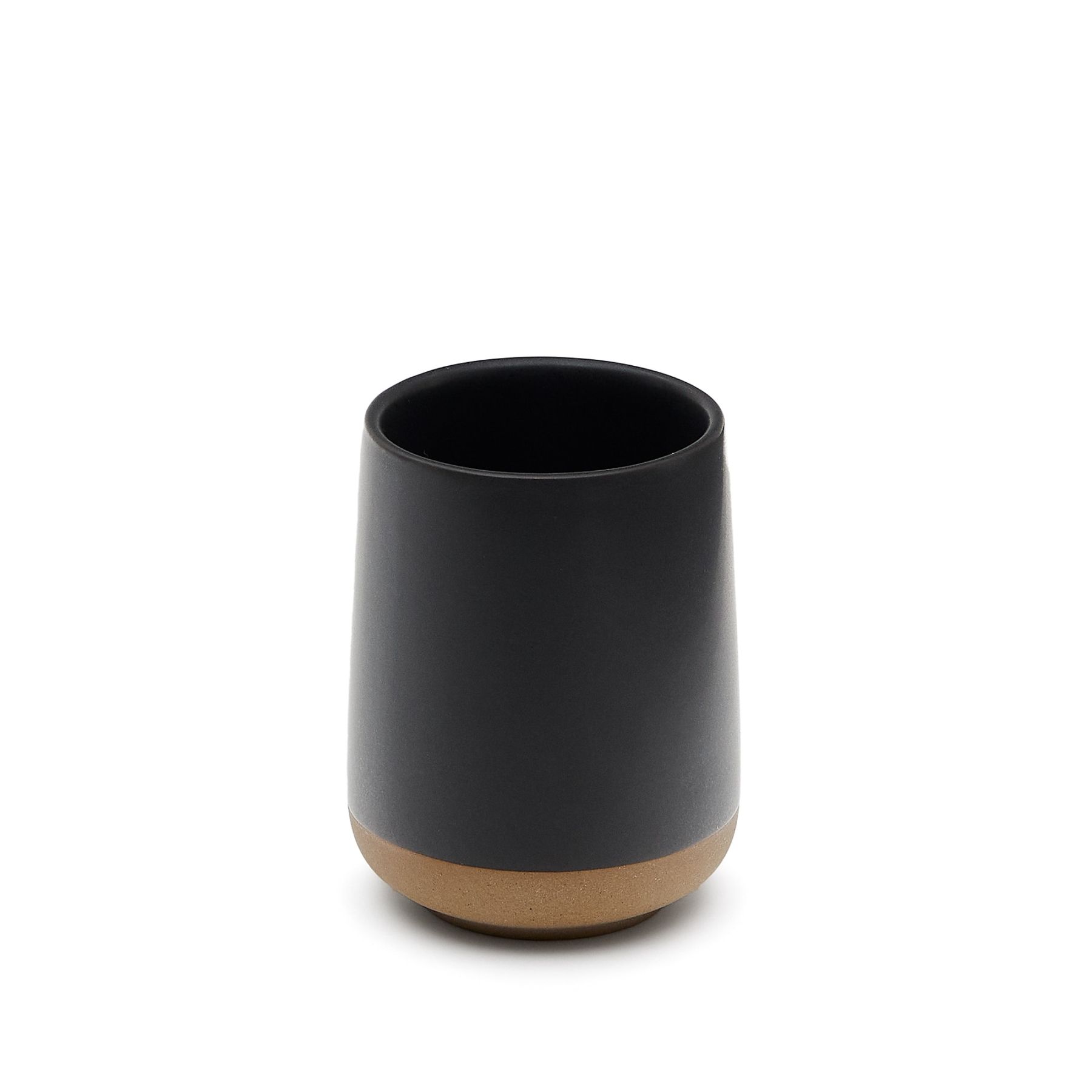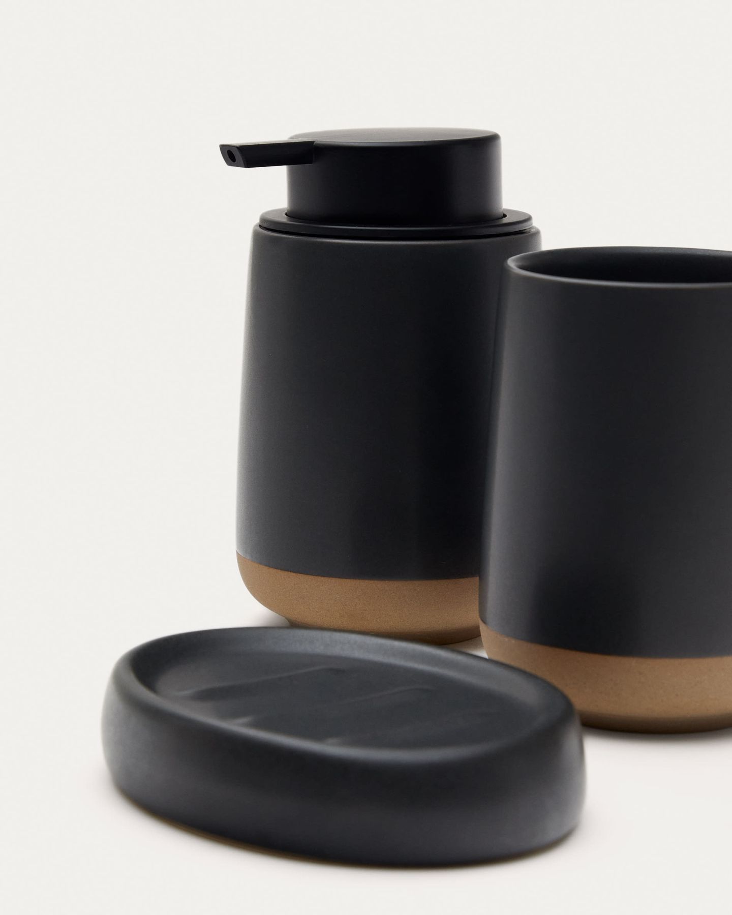 Коллекция Silma состоит из трех предметов: мыльницы, дозатора для мыла, стакана для зубных щеток. Материал изготовления – керамогранит черного цвета с бежевой отделкой. Матовое покрытие выполнено идеально ровно, что говорит о высоком качестве изготовления.