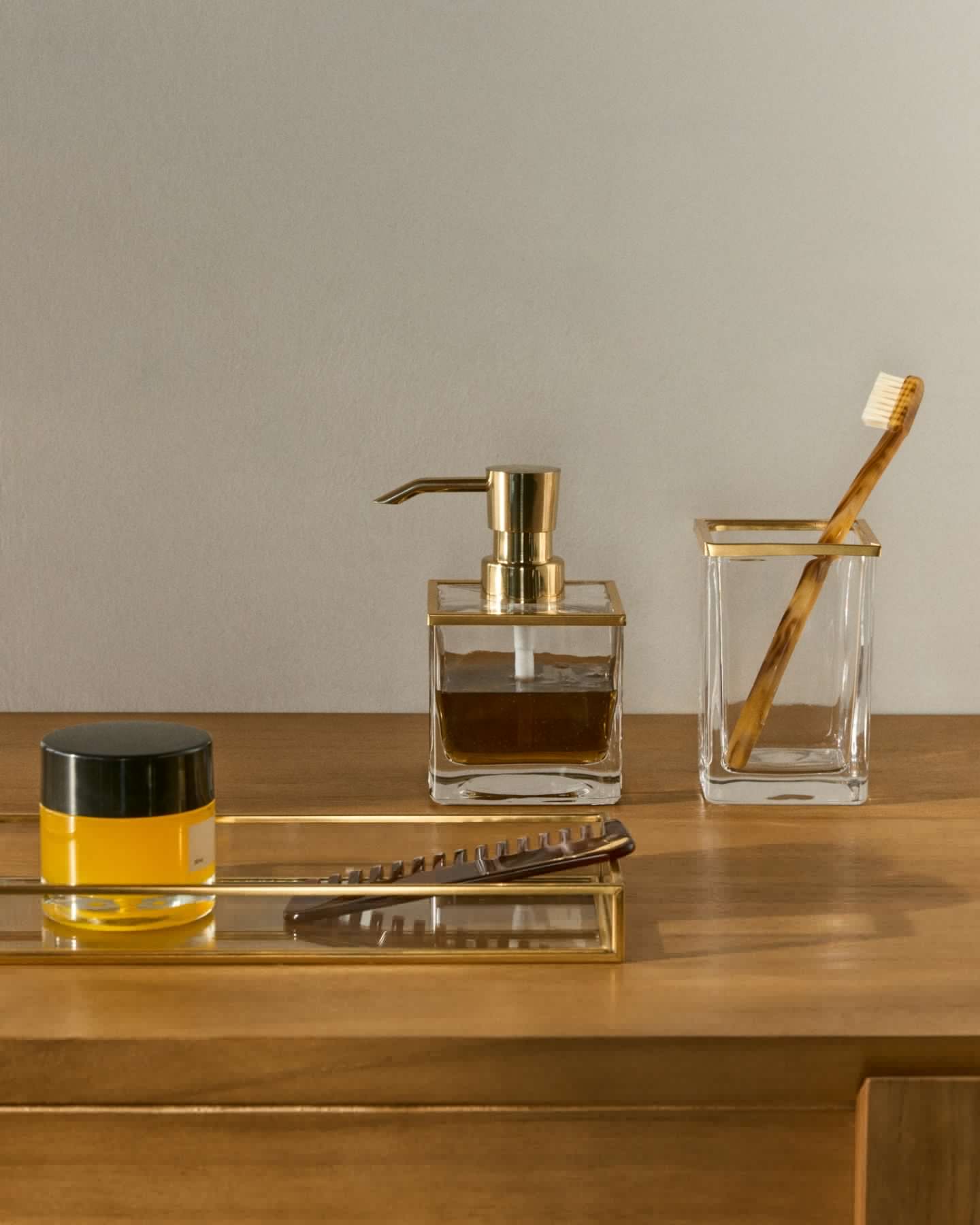Набор аксессуаров Soanet – это стекло с эффектом роскоши и шика за счет золотых деталей. Это отличный вариант дополнения ванной комнаты бесцветными деталями, когда цвета в ней достаточно. Стекло и золото – беспроигрышное сочетание и чудесный вид!