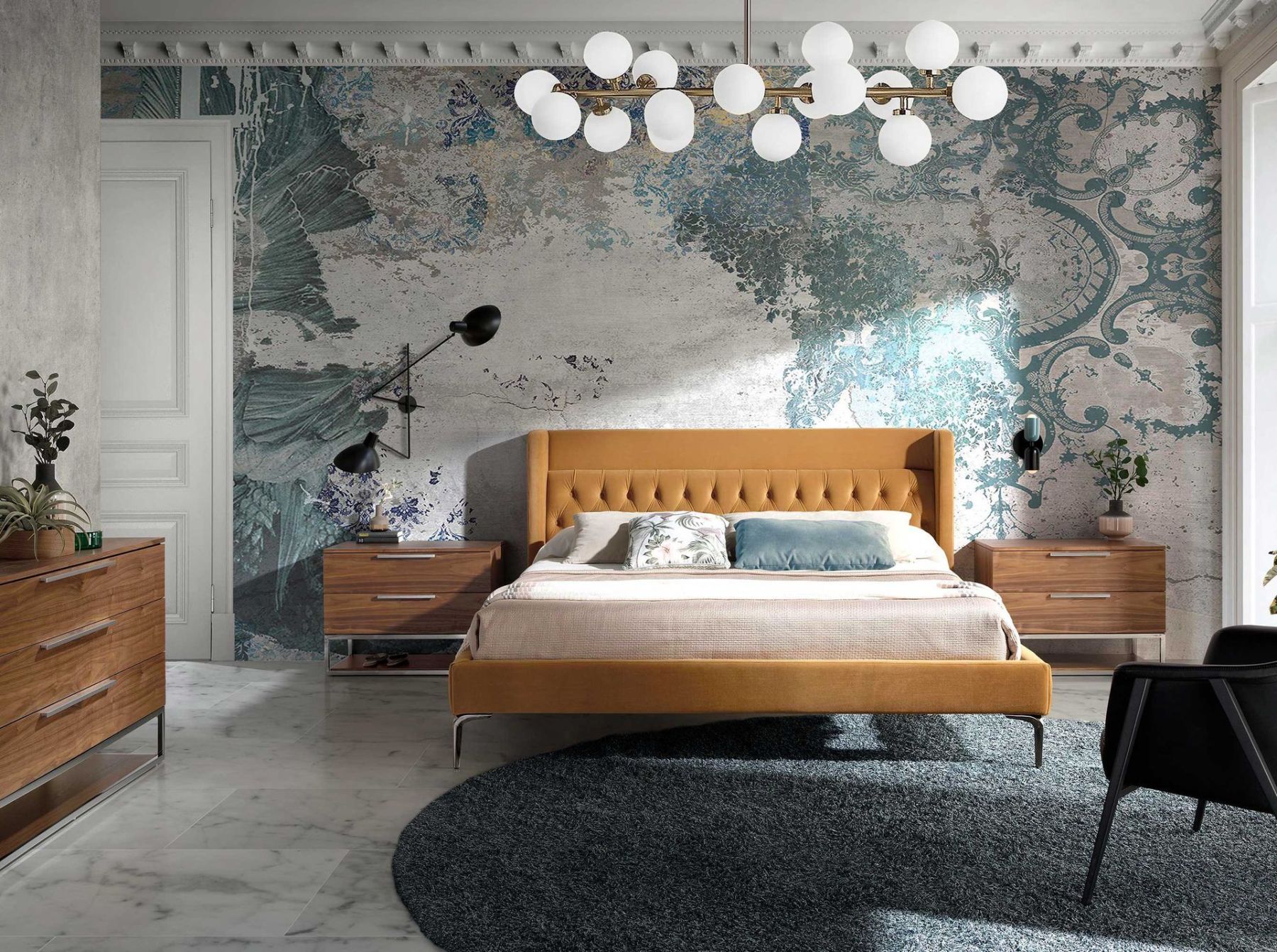Двуспальная кровать современного дизайна с оригинальным изголовьем и каркасом из бархатистой ткани горчичного цвета, а также ножками из полированной темной нержавеющей стали. Незаменимый предмет мебели для вашей спальни, который добавит ей элегантности и уюта. В комплект входит удобное многоместное основание из сосны.