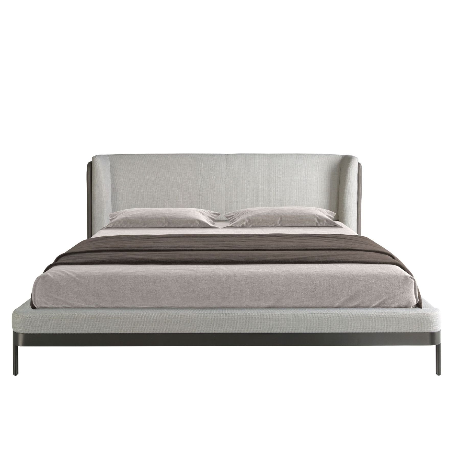 Современная двуспальная кровать с оригинальным изголовьем и конструкцией из светло-серой ткани и ножками из затемненной полированной нержавеющей стали. Ключевой предмет для вашей спальни, с помощью которого вы обеспечите элегантный и уютный стиль.