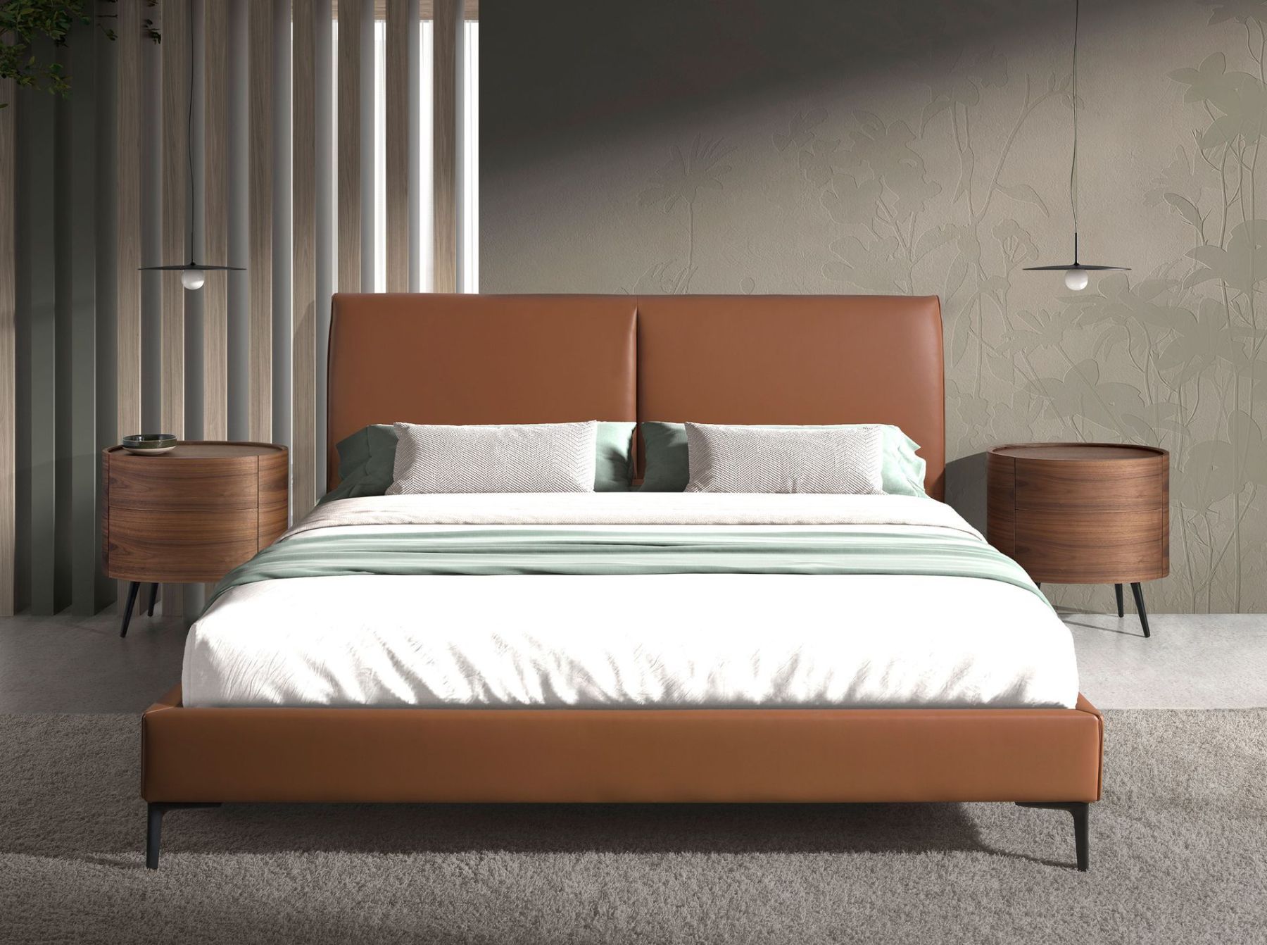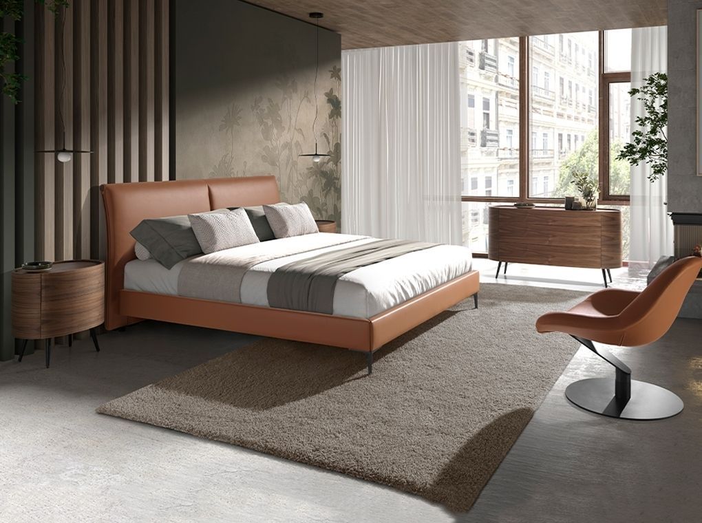 Двухместная кровать современного дизайна с оригинальным изголовьем и конструкцией из коричневой кожзаменительной кожи и черными эпоксидными ножками из нержавеющей стали. Ключевой предмет для вашей спальни, с помощью которого вы обеспечите элегантный и уютный стиль.