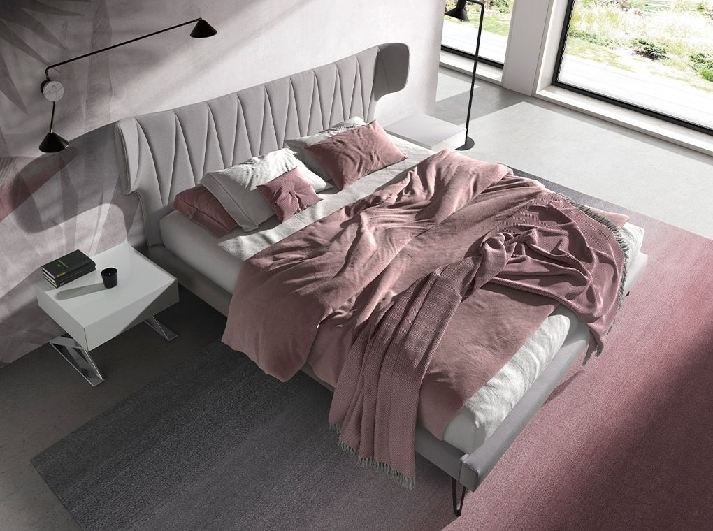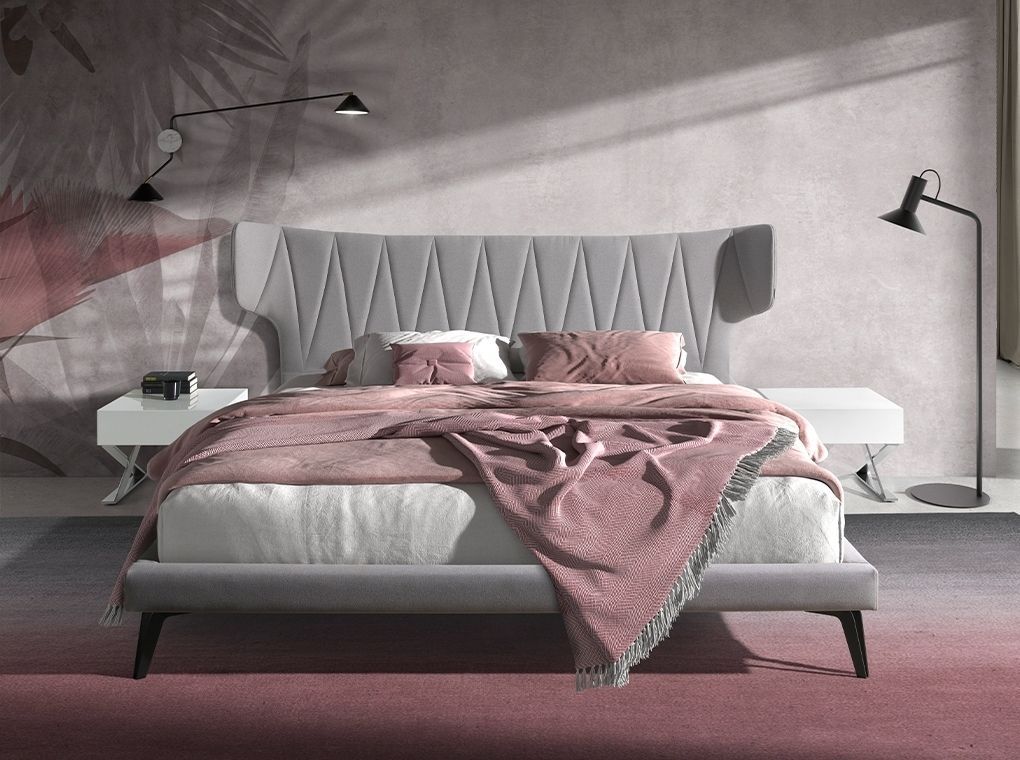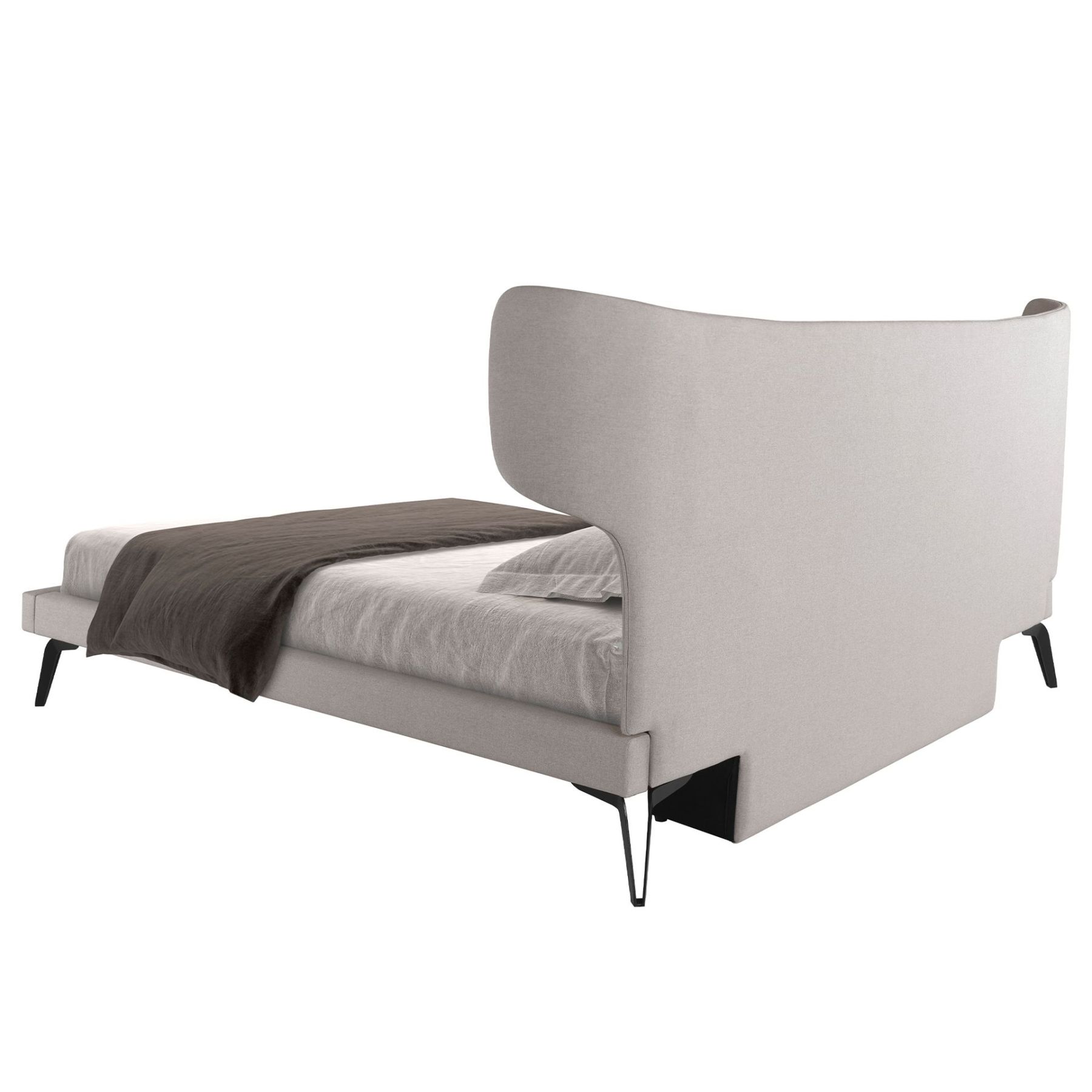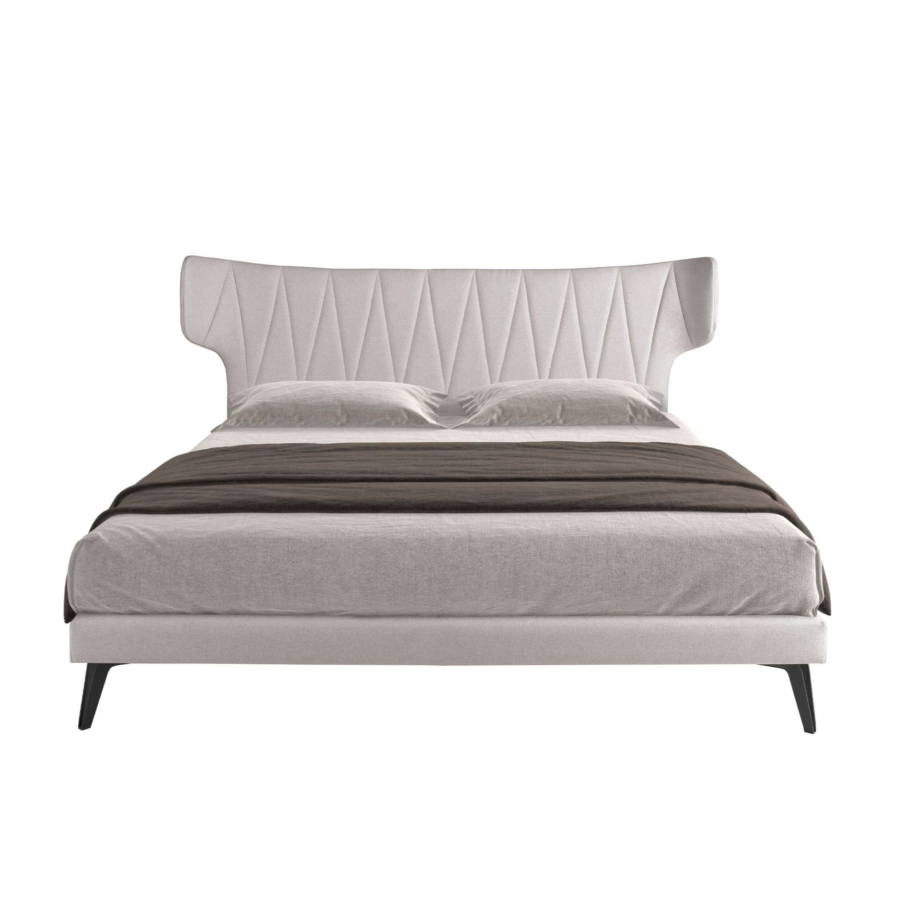 Современная двуспальная кровать с оригинальным изголовьем и конструкцией из светло-серой ткани и черными эпоксидными ножками из нержавеющей стали. Ключевой предмет для вашей спальни, с помощью которого вы обеспечите элегантный и уютный стиль.