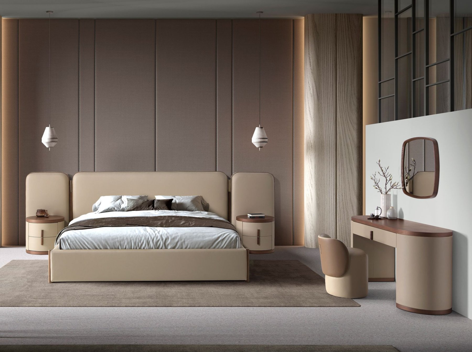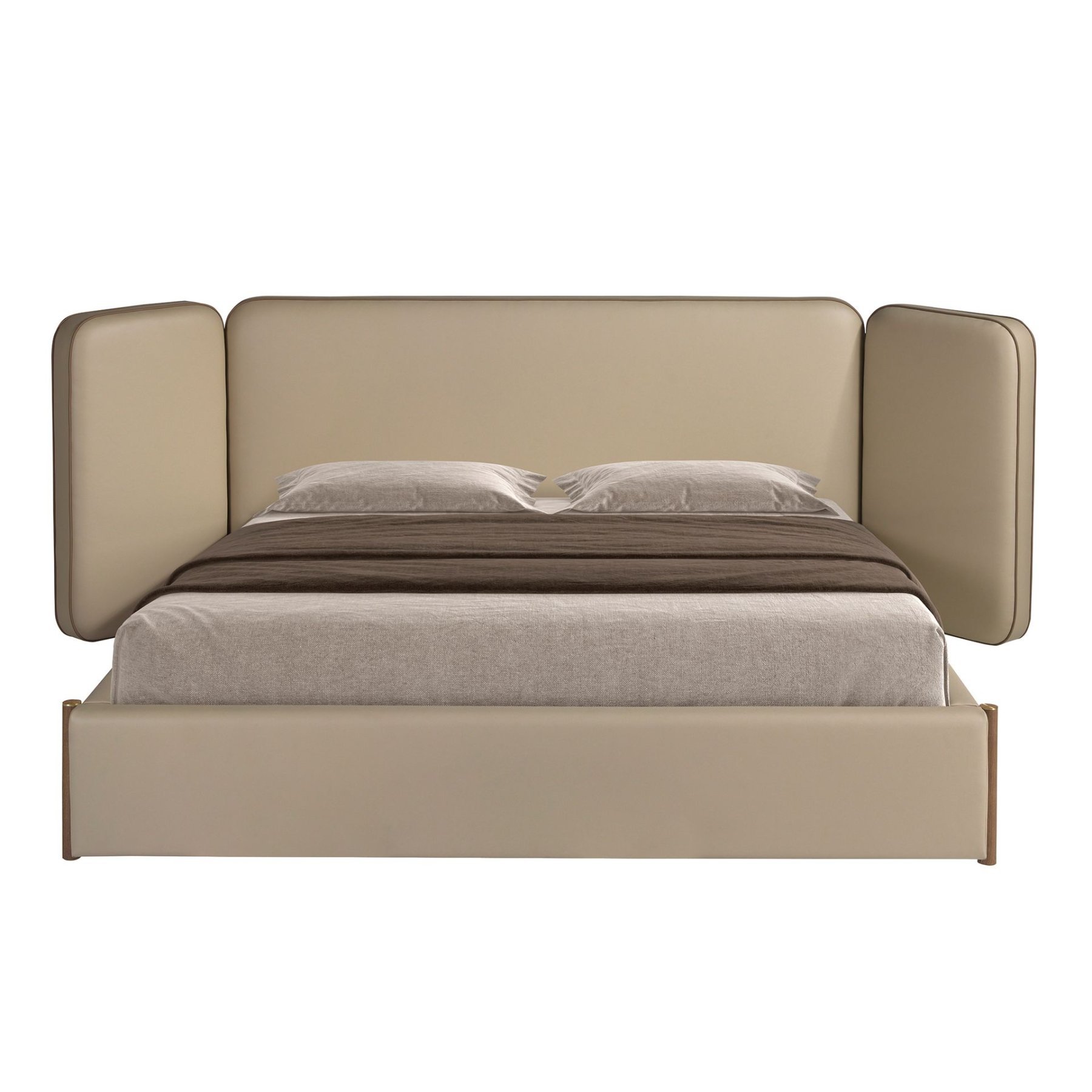 Двуспальная кровать современного дизайна с оригинальным изголовьем и каркасом из искусственной кожи цвета норки и деревянными ножками орехового цвета. Незаменимый предмет мебели для вашей спальни, который привнесет элегантность и уют. Удобное многоламельное основание из сосны. Подходит для матрасов размером 180 х 200 см.