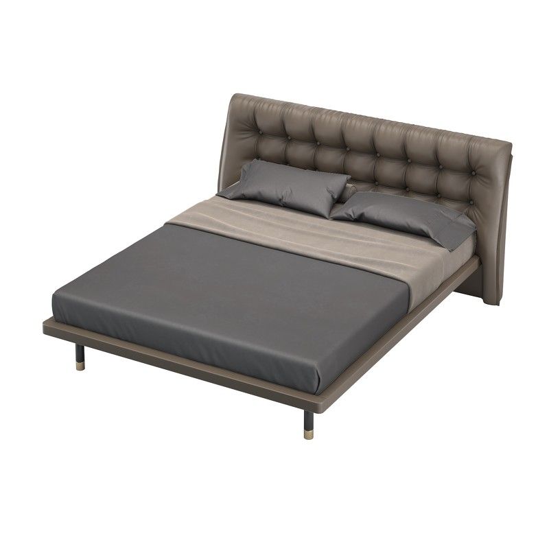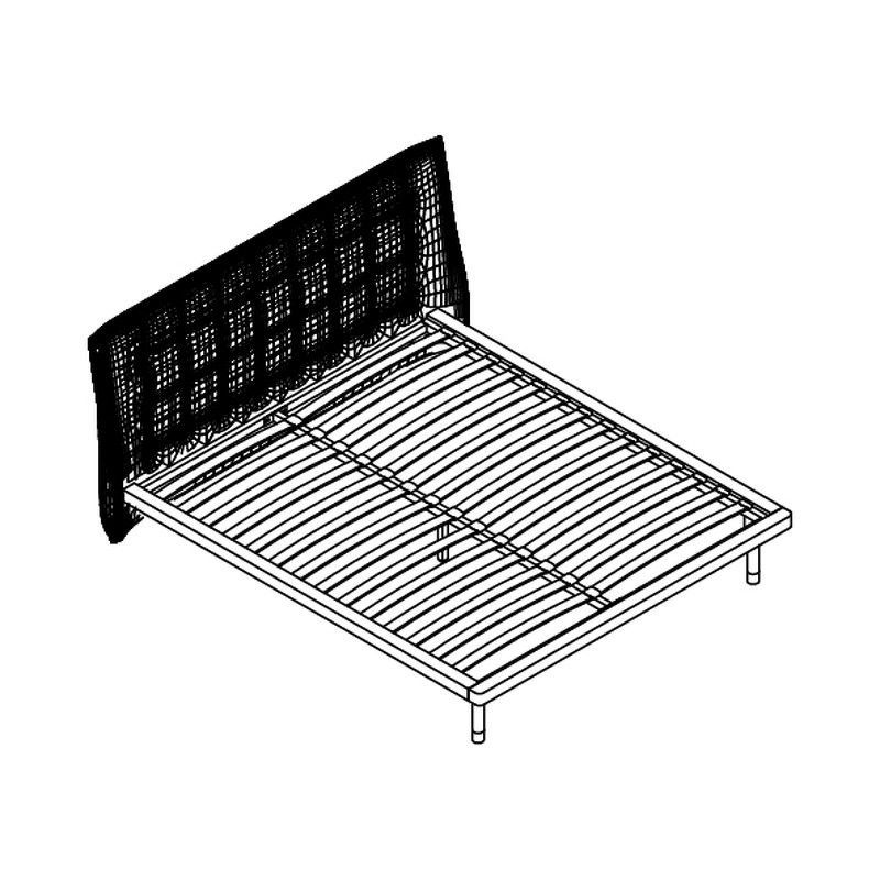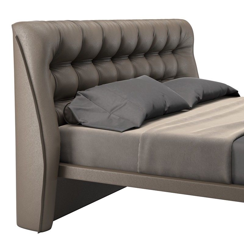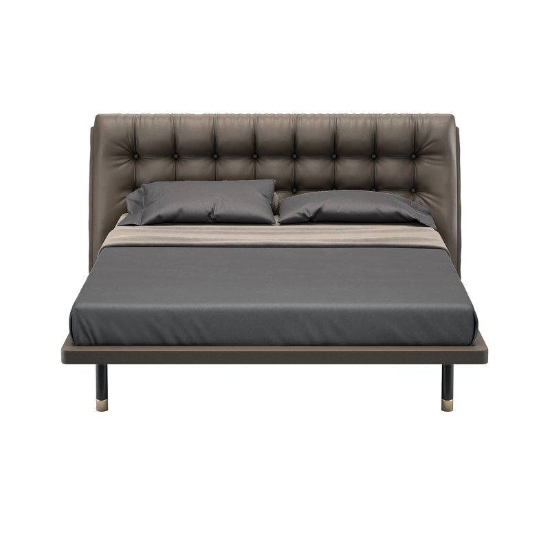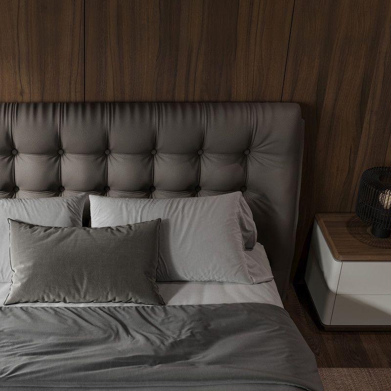 Изголовье выходит за рамки каркаса кровати по бокам, что стоит учитывать при планировании меблировки. База кровати изготовлена из МДФ класса Е1 и обита такой же экокожей, что и изголовье.
