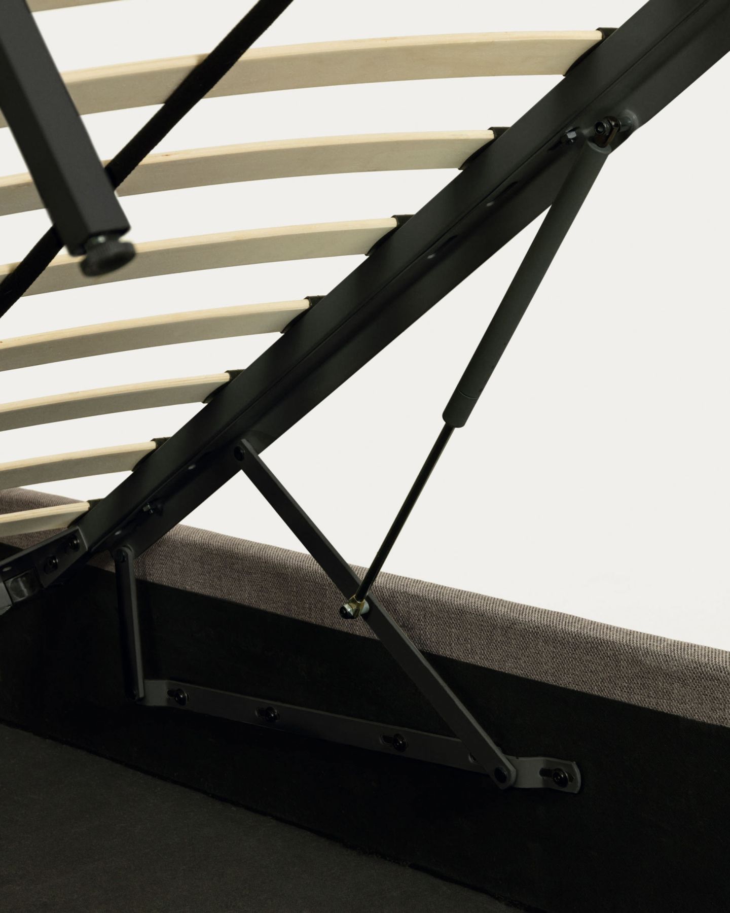 Кровать Nahiri от фабрики La Forma (ex Julia Grup) – умная конструкция для удобного хранения постели. Кровать Nahiri сможет обеспечить дополнительное пространство в вашей спальне за счет встроенного ящика для хранения постели. Это очень удобно, ведь благодаря всего паре движений можно подготовиться ко сну или быстро привести кровать в порядок. Зачем иметь только кровать, когда можно еще получить пространство для хранения? Nahiri – это правильный выбор, особенно если еще по достоинству оценить королевских размеров изголовье. Кровать Nahiri имеет внутреннюю деревянную конструкцию с металлической рамой, которая оснащена газопоршневым механизмом. По всему периметру каркас обшит синтетической тканью (синель), которая отличается высокой износостойкостью, простой очисткой от загрязнений. Плотность материала – 280 г/м2. Под тканью есть слой наполнителя из пенополистирола. Ящик для хранения имеет объем 640 литров, находится под реечным основанием, которое поднимается вверх. Основание состоит из 12 поперечных планок размером 55 X 9 мм. Они обеспечивают комфортную амортизацию, равномерно распределяют нагрузку. Благодаря прочным ножкам с защитными пластиковыми наконечниками и металлической раме, кровать способна выдерживать нагрузки до 500 кг. Размеры: ширина – 171 см, высота – 90 см, глубина – 215 см. Кровать совместима с матрасом размером 160 х 200 см. Матрас не входит в комплектацию, но представлен в каталоге отдельно. Также можно в дополнение приобрести комплект постельного белья. Вес изделия – 42,8 кг. Потребуется самостоятельная сборка. Инструкция и крепеж включены в комплектацию.