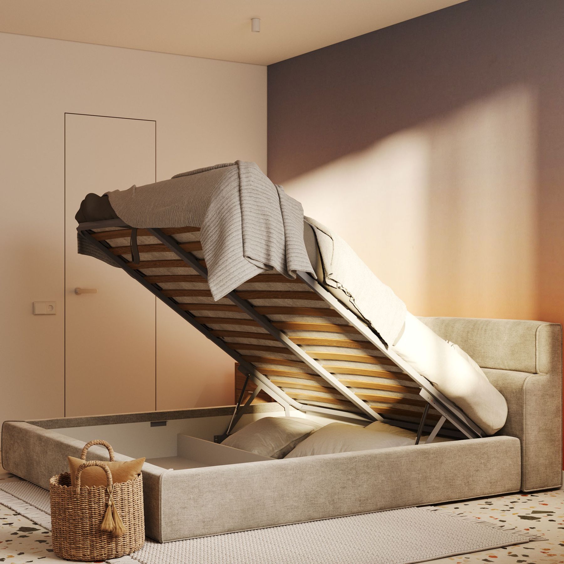 Кровать сочетает в себе не только изящный образ, но и функциональность. Теперь в ней можно хранить постельные принадлежности благодаря удобному подъемному механизму. Чтобы поместить все необходимое в секцию для хранения, просто поднимите основание—решетку. Благодаря встроенным газ—лифтам — специальным механизмам, облегчающим подъем, основание поднимается и опускается без усилий, не хлопает при закрытии.