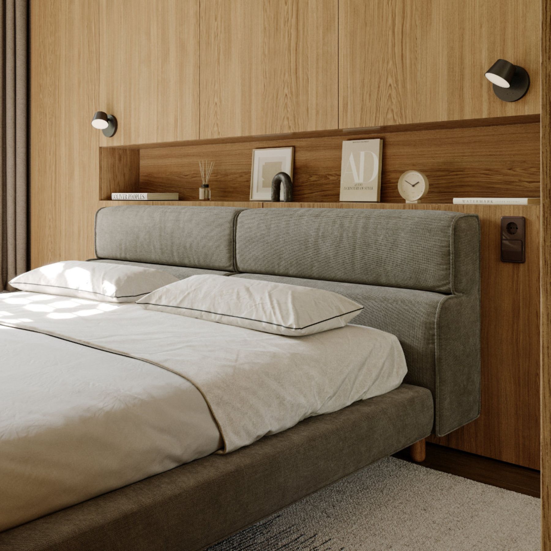 Мягкое изголовье кровати выполнено из прямоугольных блоков обтекаемой формы с эффектом «каскада». Продуманная до мелочей эргономика позволяет максимально удобно расположиться на кровати в любом положении.