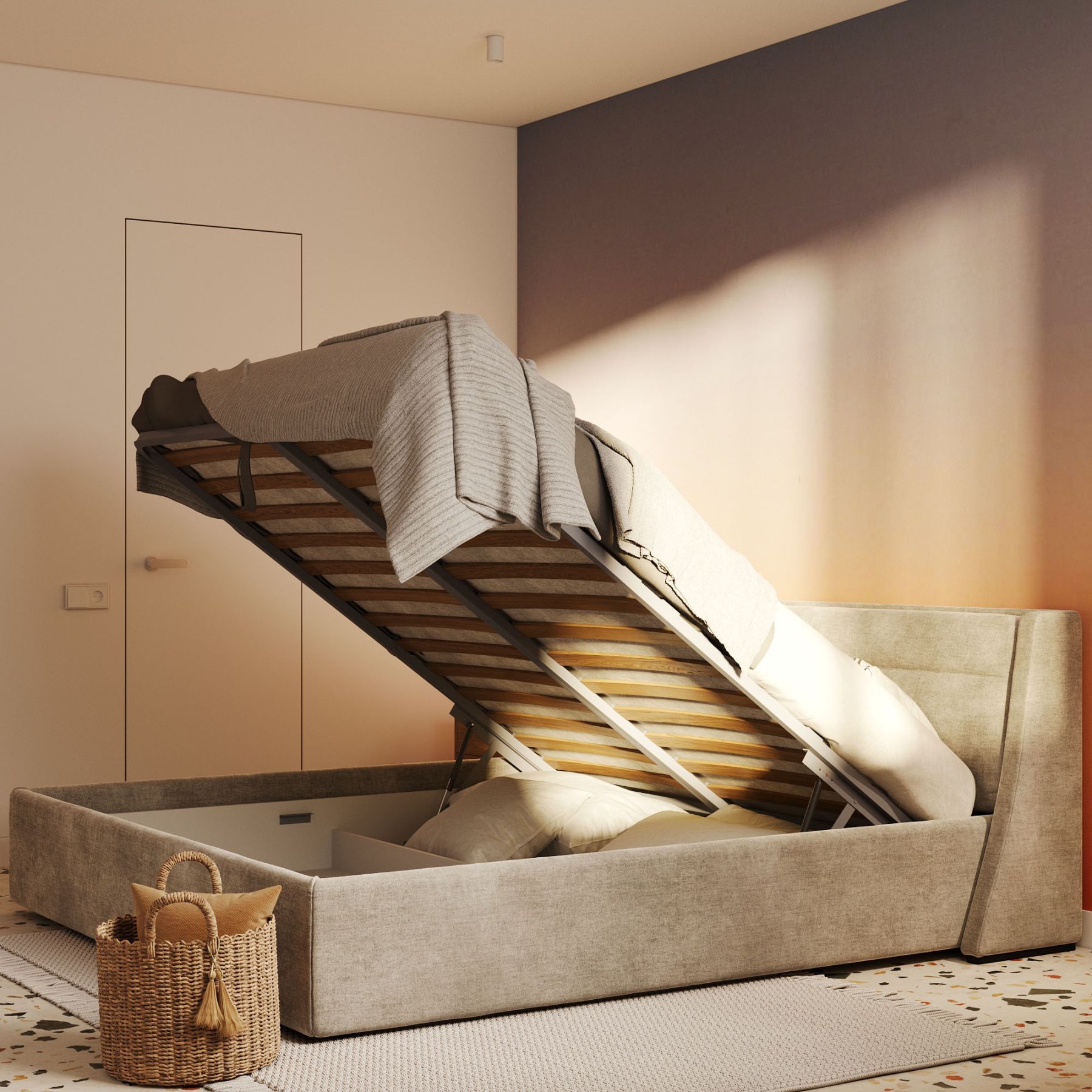На этой кровати удобно не только спать, в ней можно хранить постельные принадлежности и другие вещи — она оснащена подъемным механизмом. Чтобы поместить все необходимое в отделение для хранения, просто поднимите основание-решетку.