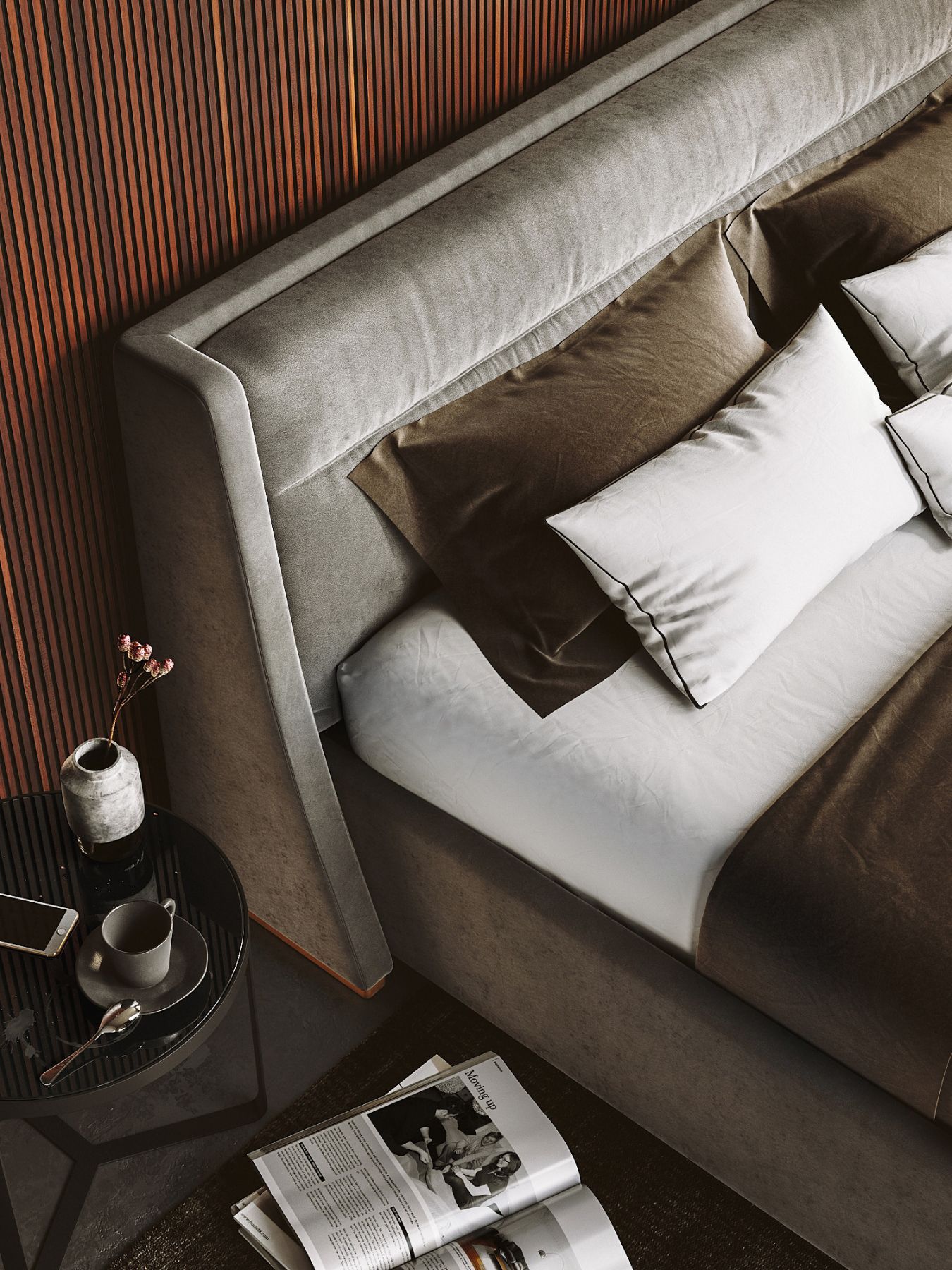 Плавные линии каркаса изголовья, изящные переходы между деталями и отсутствие острых углов подчеркивают легкость и утонченность этой кровати. На царге отсутствуют видимые швы и стыки.