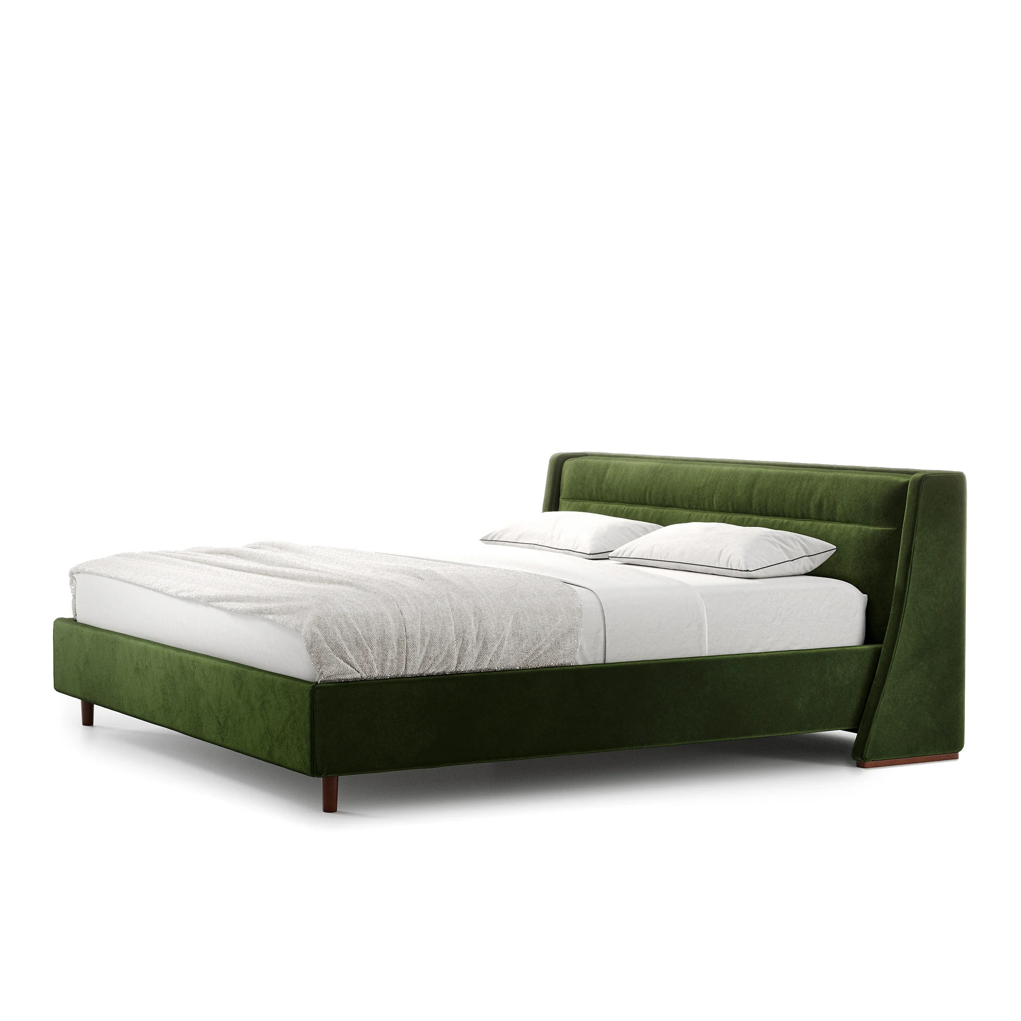 Изящные изгибы изголовья, плавно переходящие от боковой части в приспинную, создают притягательный и легкий дизайн этой кровати. Изголовье с ровными горизонтальными линиями глубокой стяжки обтянуто тканью со всех сторон, кровать можно разместить даже в центре спальни. А благодаря возможности выбора цвета ткани и тонировки ножек она будет отлично смотреться в разных интерьерах.
