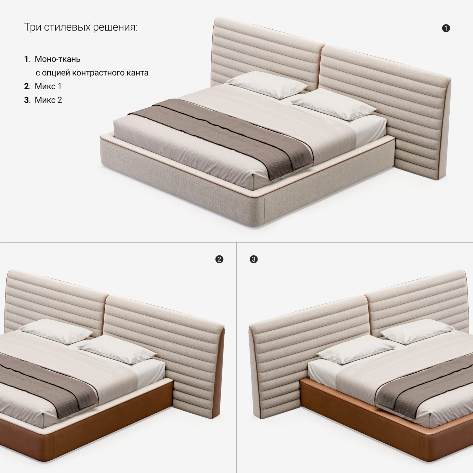 На выбор — три конфигурации изголовья: вровень с основанием или с боковыми выступами на 18 или 50 см для большего простора.