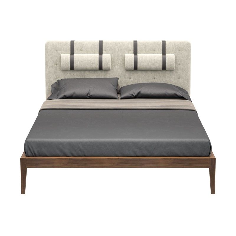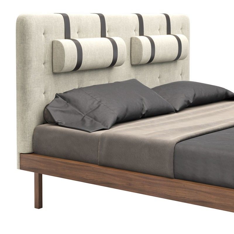 Изголовье и валики в ткани типа рогожки в серых тонах. Ремни, поддерживающие валики выполнены из эко-кожи коричневого цвета. Высоту валиков можно регулировать по вертикали.
