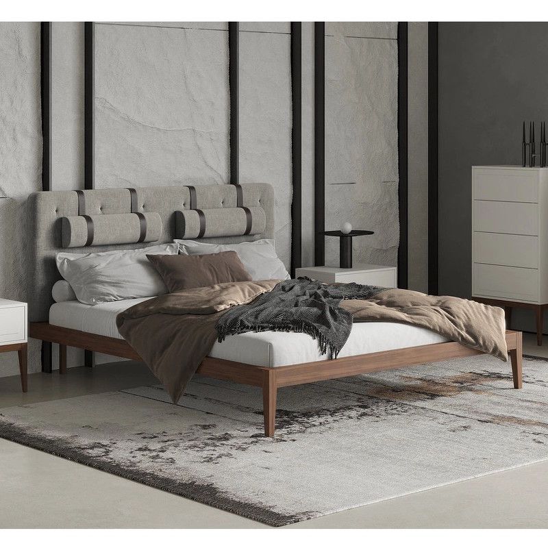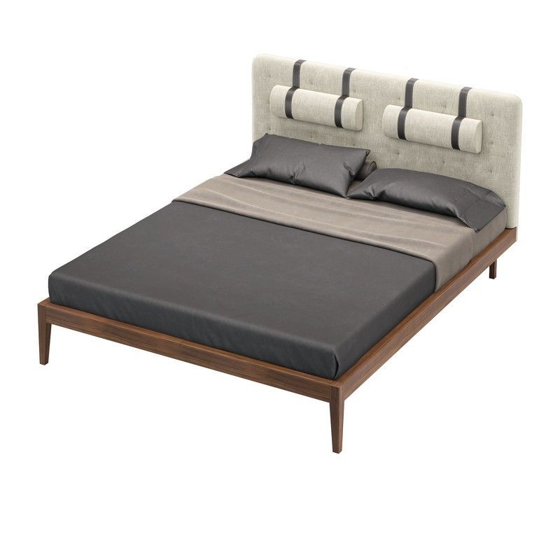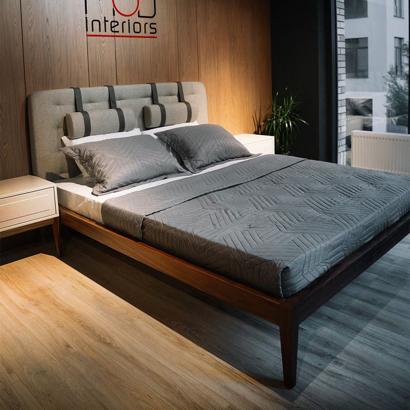 База кровати выполнена из массива дерева, изголовье выполнено из высококачественной сертифицированной МДФ класса Е1 (Новая Зеландия). Отделка в шпоне американского ореха (Северная Америка). Ножки в зоне изголовья утоплены внутрь каркаса, что создает эффект парения при подходе к кровати сбоку.