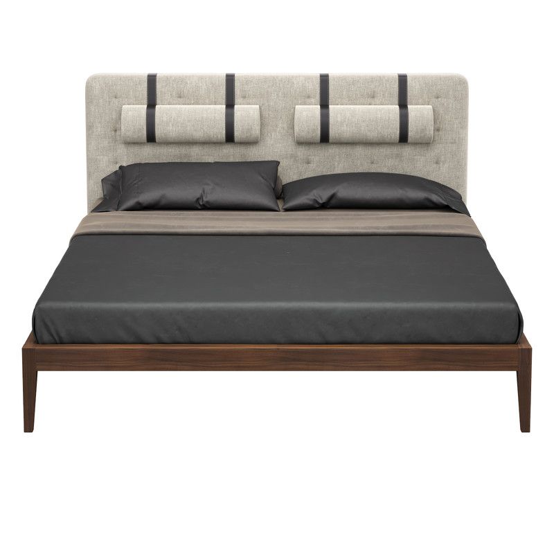 Изголовье и валики в ткани типа рогожки в серых тонах. Ремни, поддерживающие валики выполнены из эко-кожи коричневого цвета. Высоту валиков можно регулировать по вертикали.