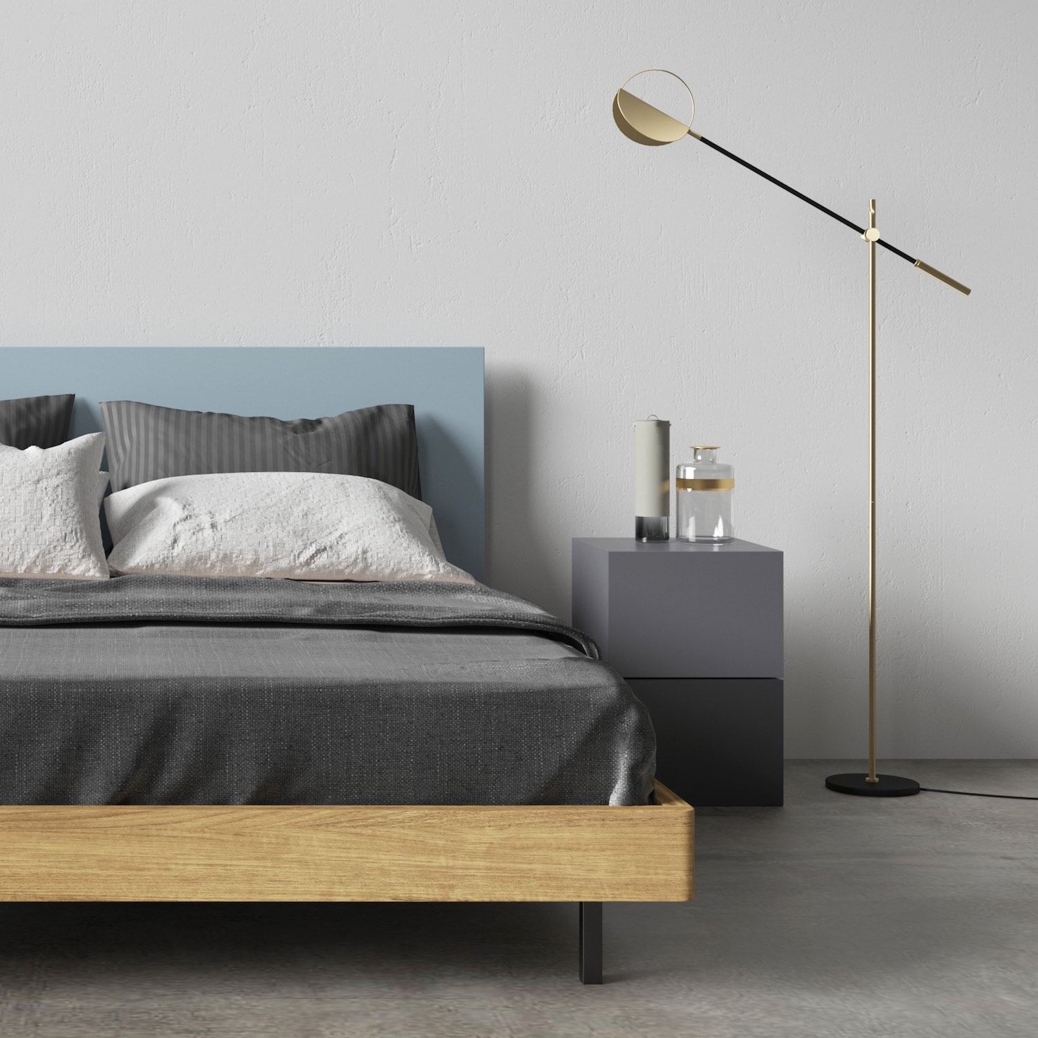 Ортопедическая решетка для матраса в комплекте. Расположение тумбы возможно как слева, так и справа, на выбор. Размеры спального места: Ш.180 см, Г.200 см. Каркас кровати и подвесная полка-лак, изголовье- эмаль голубая ral design 240-70-10, верх декоративного элемента в форме овала -эмаль серая ral 7015, низ- эмаль черная ral 9011, вертикальная полоска на овале ral 1036, ножки-эмаль черная ral 9011