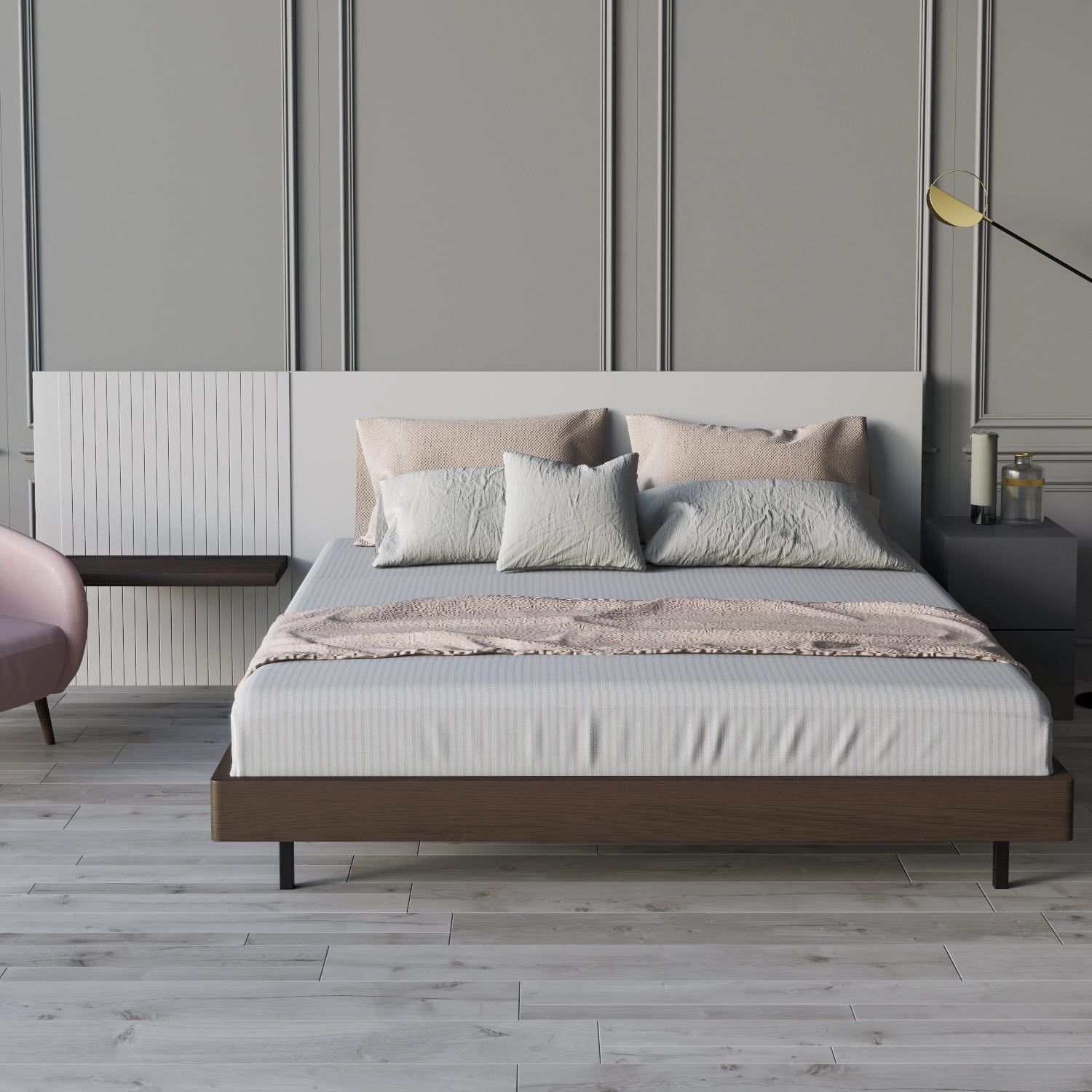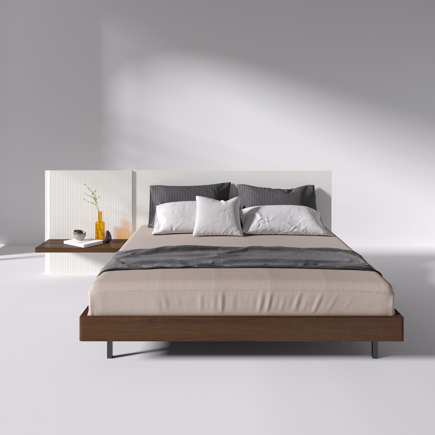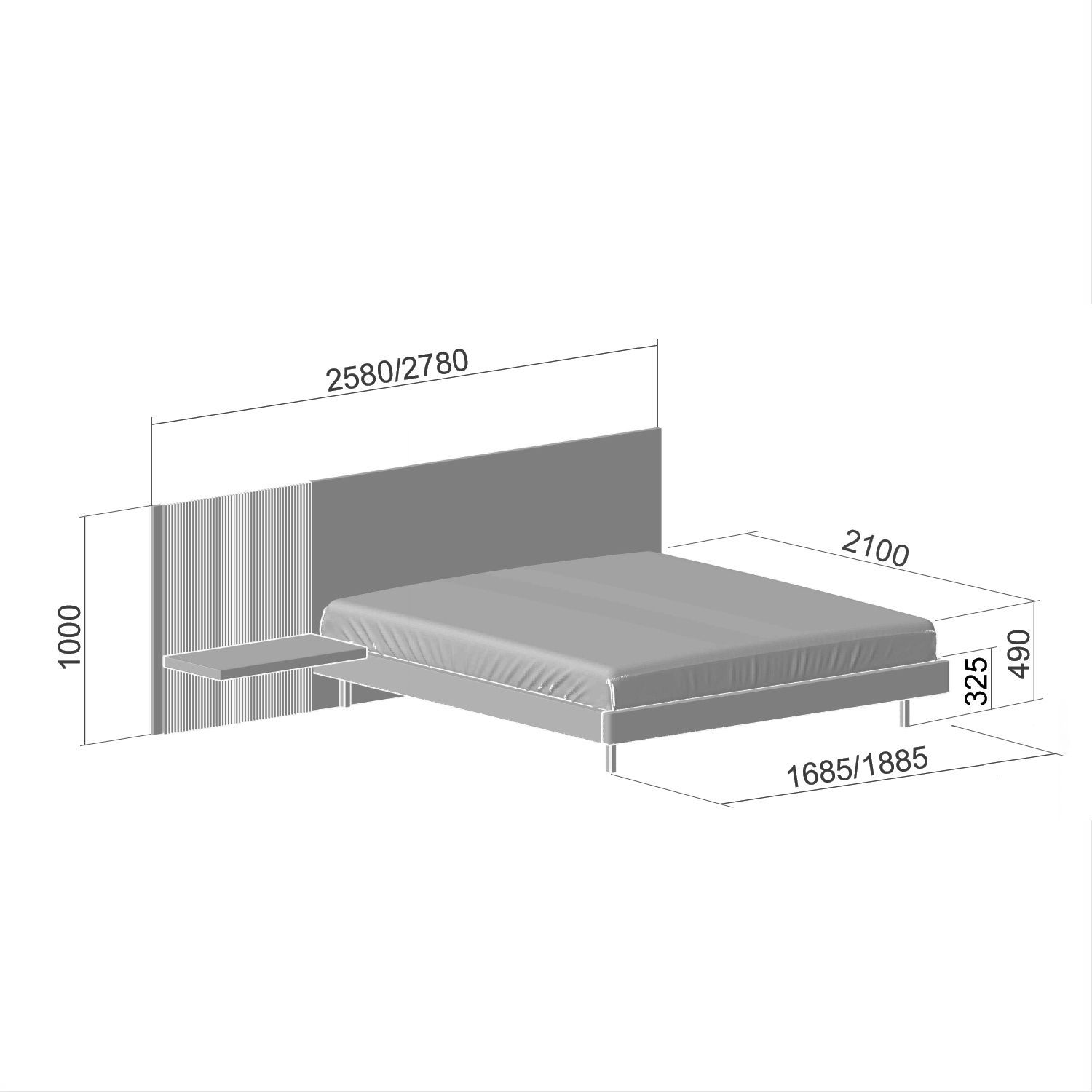 Ортопедическая решетка для матраса в комплекте. Расположение тумбы возможно как слева, так и справа, на выбор. Размеры спального места: Ш.160 см, Г.200 см. Каркас кровати и подвесная полка-темная тонировка, изголовье-эмаль белая ral 9003, ножки-эмаль черная ral 9011
