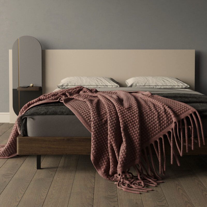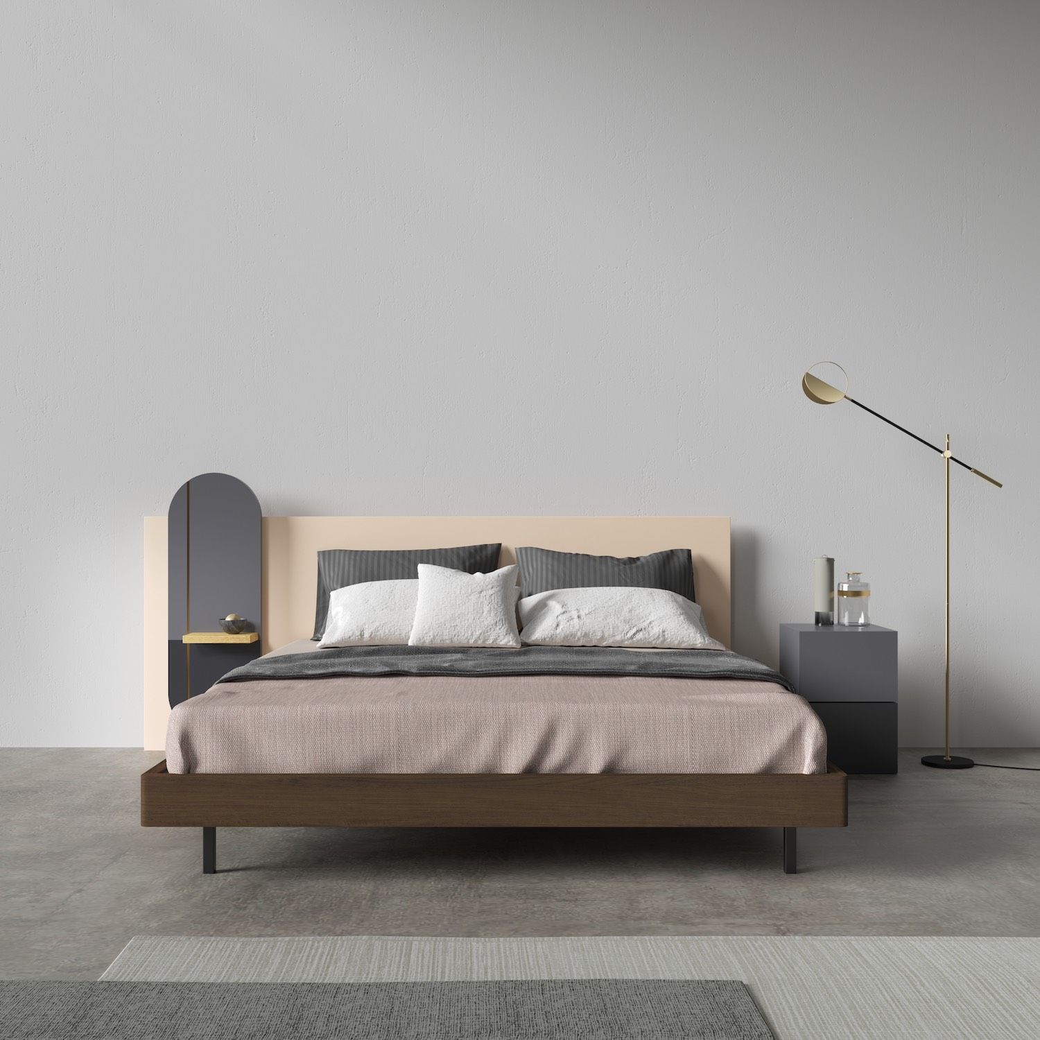 Ортопедическая решетка для матраса в комплекте. Расположение тумбы возможно как слева, так и справа, на выбор. Размеры спального места: Ш.180 см, Г.200 см. Каркас кровати-темная тонировка, подвесная полка- лак, изголовье- эмаль ral design «light corn» 070-90-10, верх декоративного элемента в форме овала -эмаль серая ral 7015, низ- эмаль черная ral 9011, вертикальная полоска на овале ral 1036, ножки-эмаль черная ral 9011