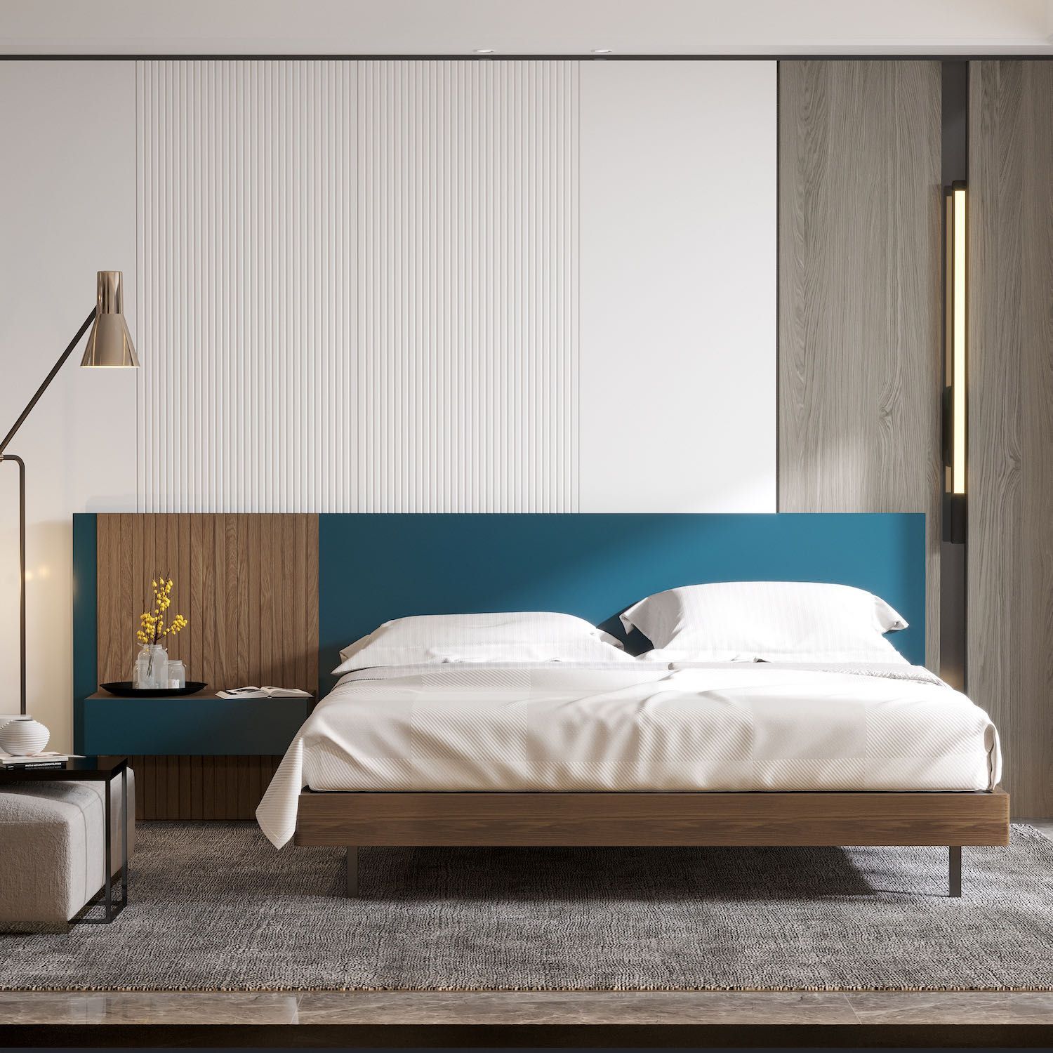 Ортопедическая решетка для матраса в комплекте. Расположение тумбы возможно как слева, так и справа, на выбор.  Размеры спального места: Ш.160 см, Г.200 см. Каркас кровати, декоративный элемент с фрезировкой на изголовье кровати и корпус тумбы-темная тонировка, изголовье и фасад ящика-бирюзовая эмаль ral design 220-20-15, ножки-эмаль черная ral 9011