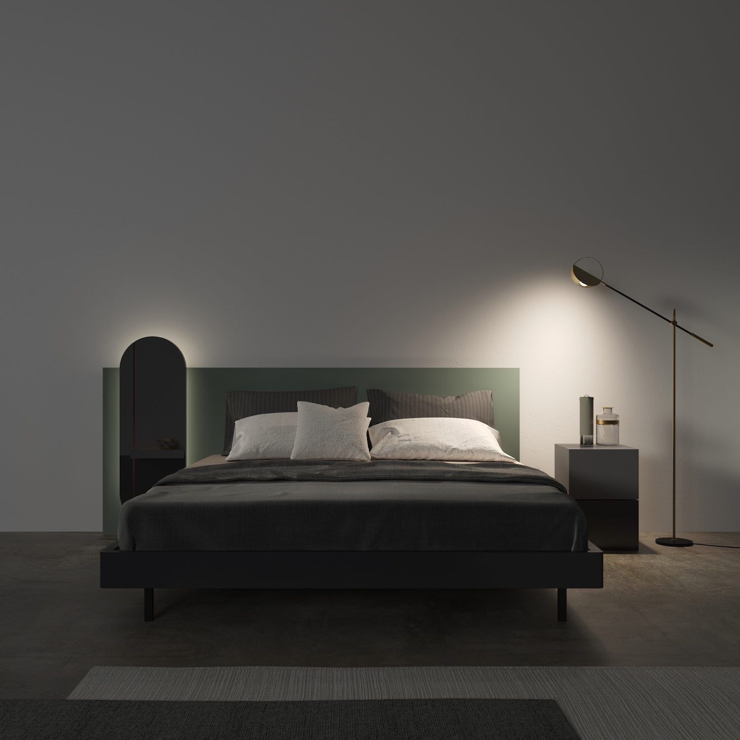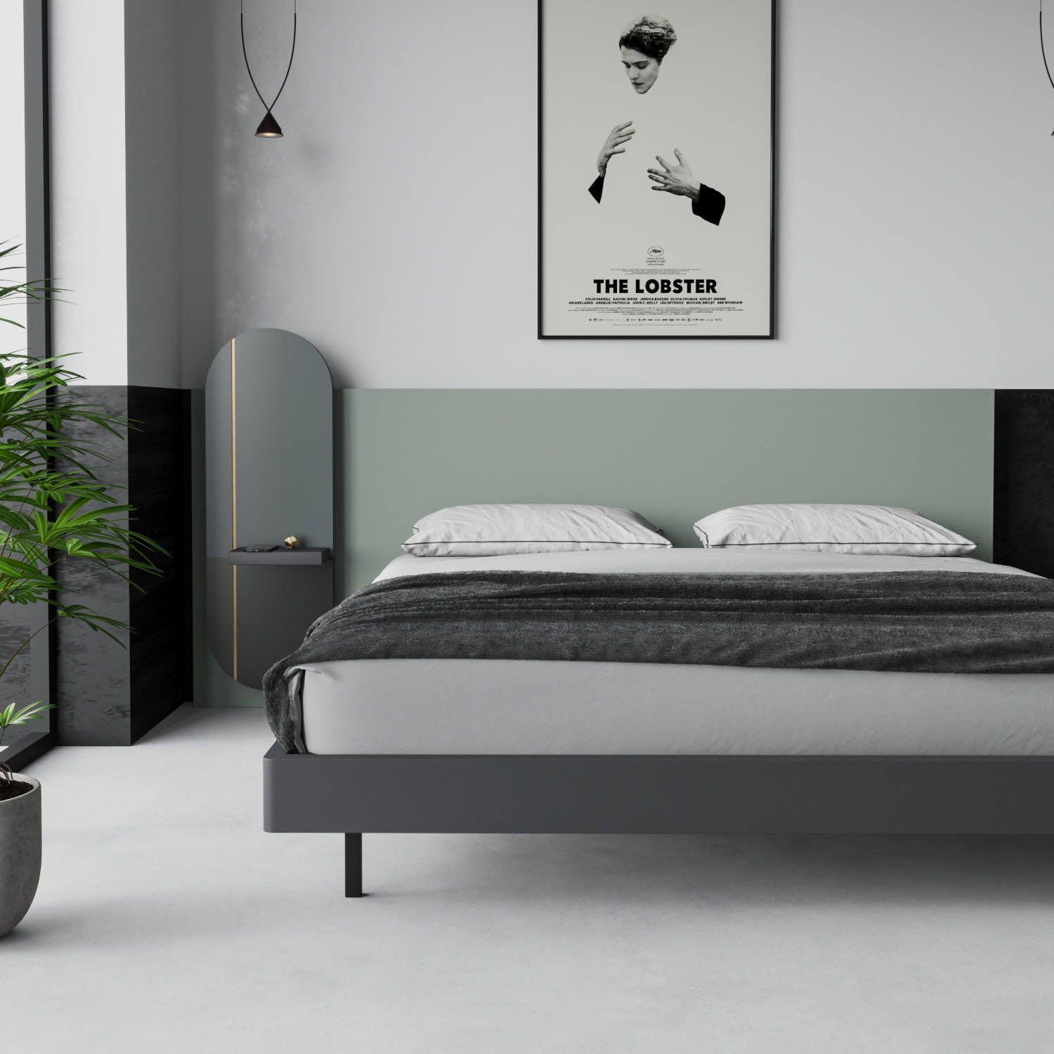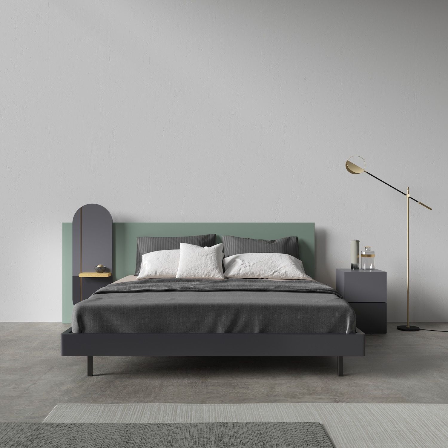 Ортопедическая решетка для матраса в комплекте. Расположение тумбы возможно как слева, так и справа, на выбор. Размеры спального места: Ш.180 см, Г.200 см. Каркас кровати-эмаль серая ral 7015, подвесная полка- лак, изголовье- эмаль ral design 160-50- 05, верх декоративного элемента в форме овала -эмаль серая ral 7015, низ- эмаль черная ral 9011, вертикальная полоска на овале ral 1036, ножки-эмаль черная ral 9011