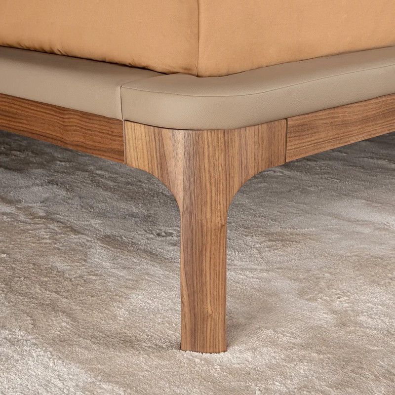 Отделка - натуральный шпон американского ореха. Теплый оттенок ореха отлично подходит к нежному бежевому оттенку эко-кожи на изголовье и базе кровати.