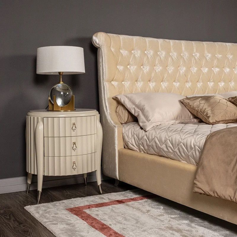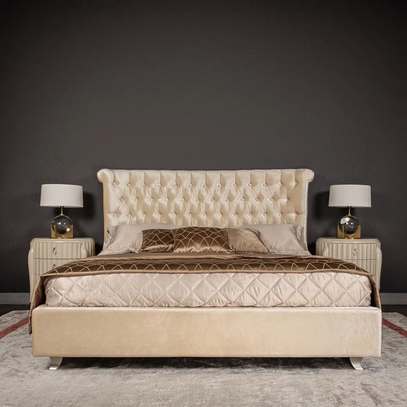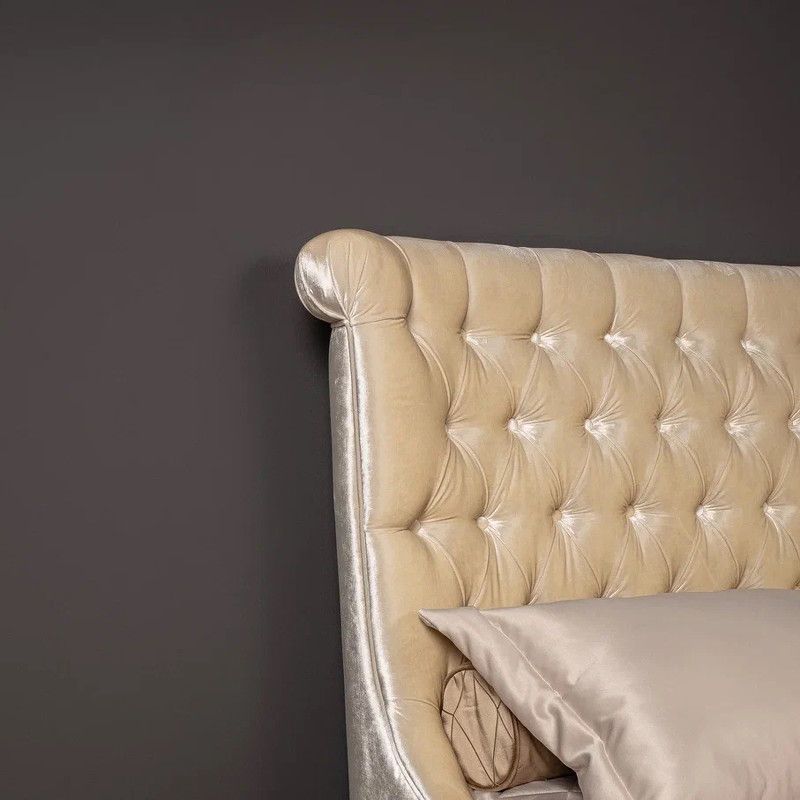 Эксклюзивная модель двуспальной кровати на низких серебряных ножках. Модель выполнена в неоклассическом стиле. Высокое изогнутое изголовье декорировано стежкой «капитоне».