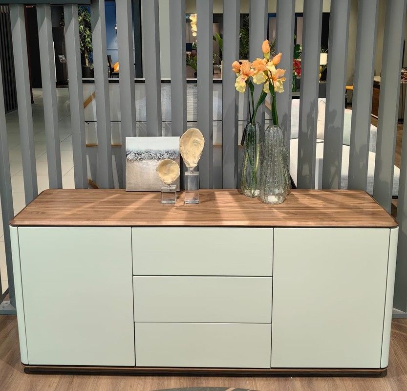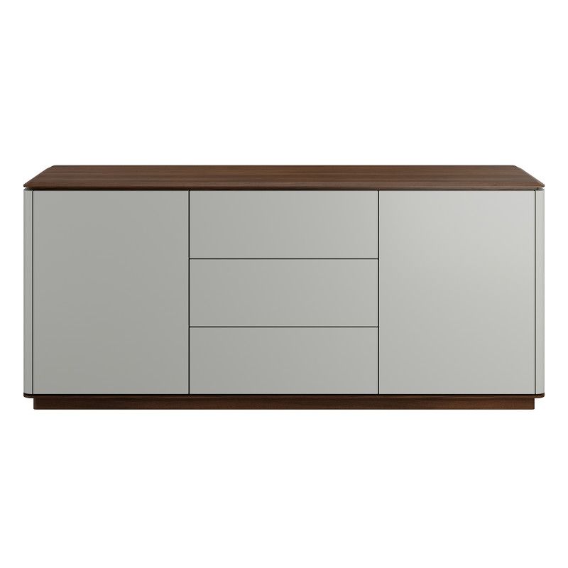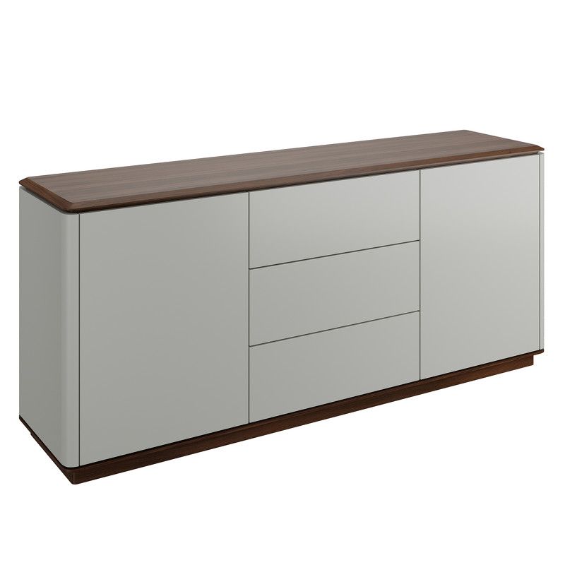Буфет выполнен из высококачественного МДФ высокой прочности. Отделка корпуса и фасадов - матовый лак приятного светло-серого оттенка. Отделка столешницы и базы - натуральный шпон ореха.