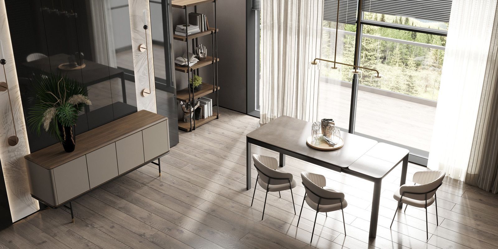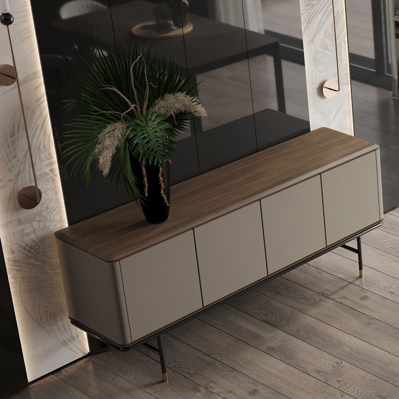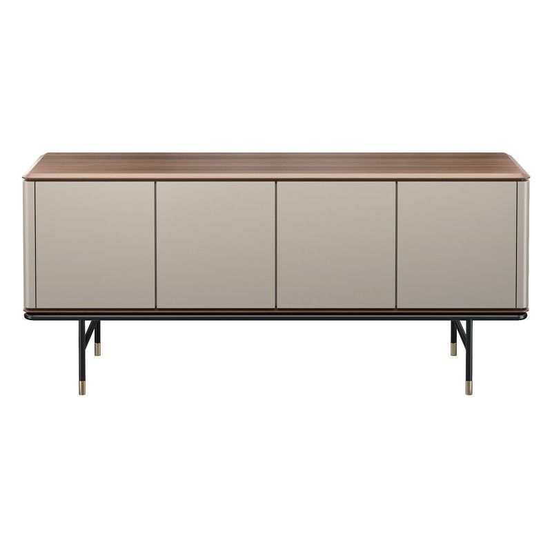 Столешница буфета выполнена в натуральном шпоне ореха и имеет скругленные углы, что предотвращает травмирование. Фасады в отделке благородным бежевым матовым лаком.