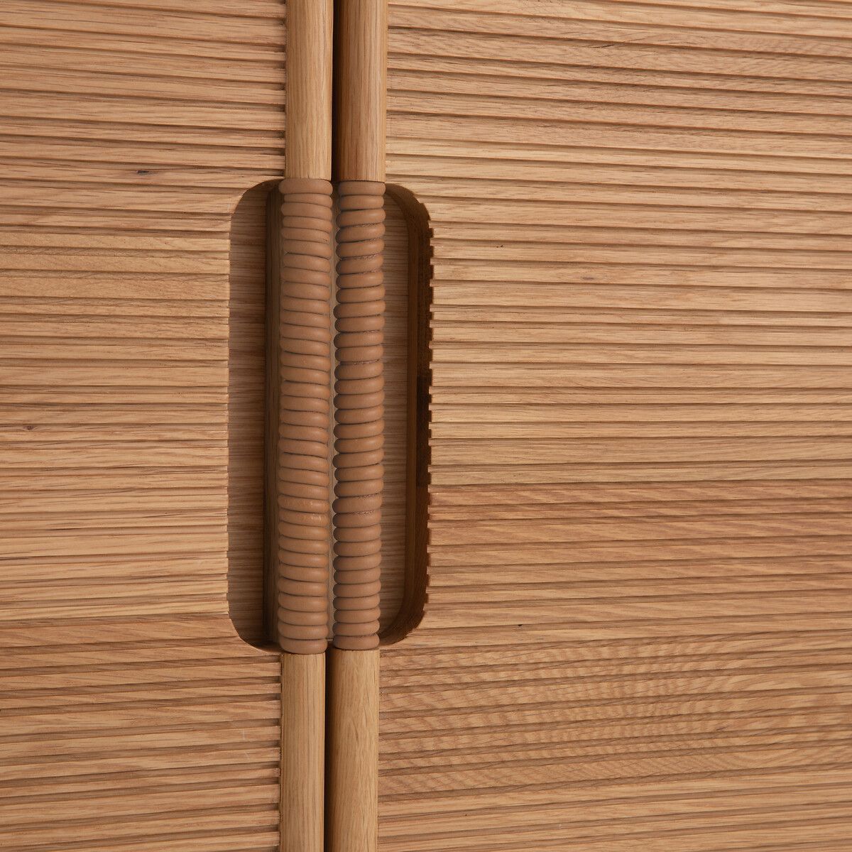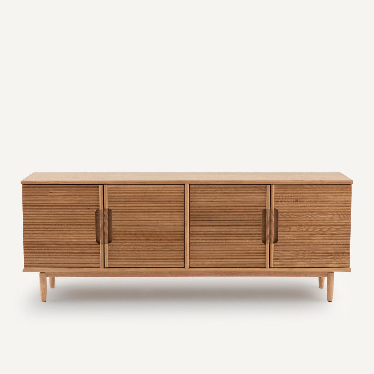 Простой дизайн этого буфета сочетается со столешницей со скошенными гранями, граненой отделкой дверок и кожаными вставками на ручках. Функциональный, с большим объемом для хранения, с качественной отделкой: ручки обтянуты кожей, немецкие скобяные изделия.
