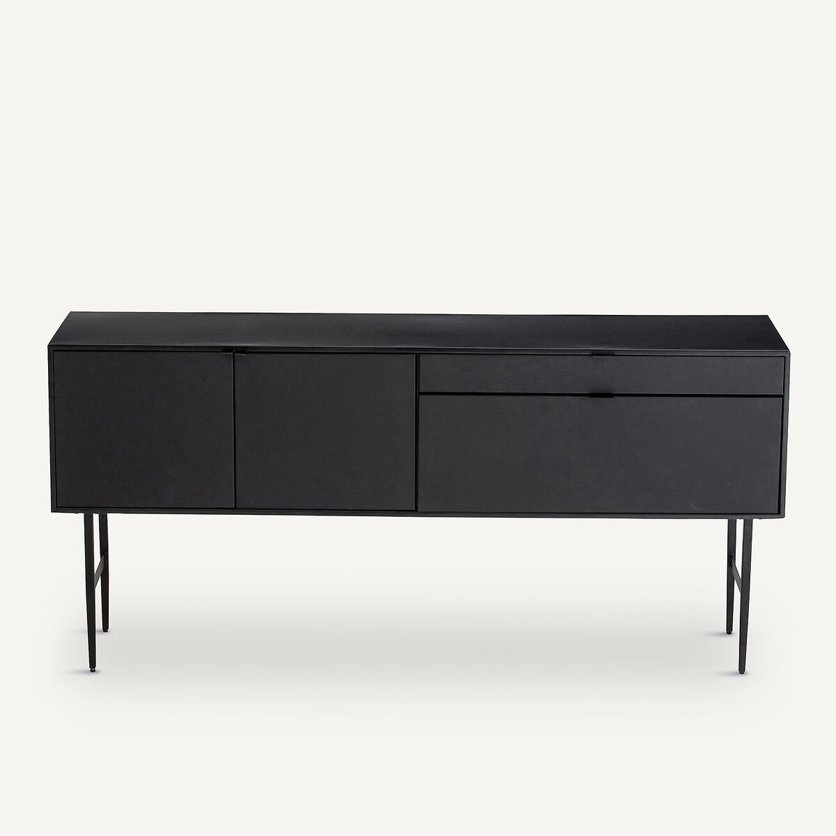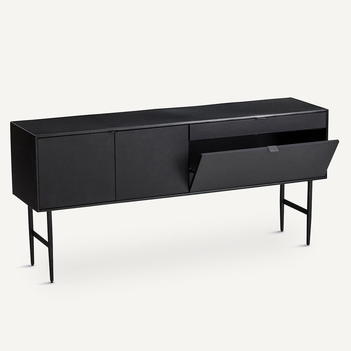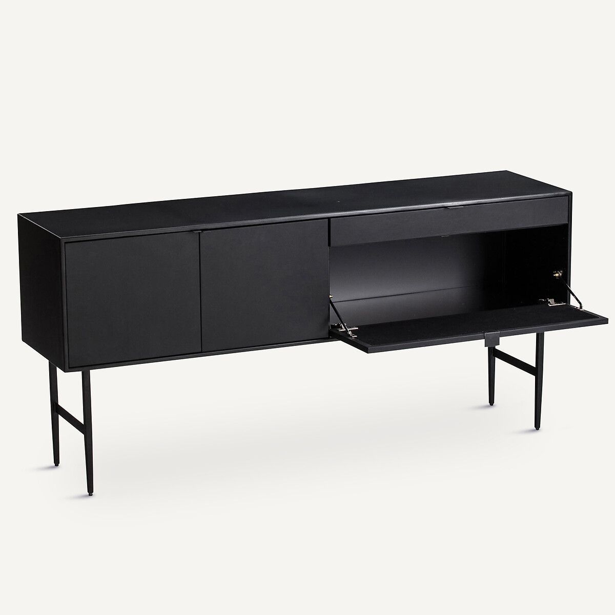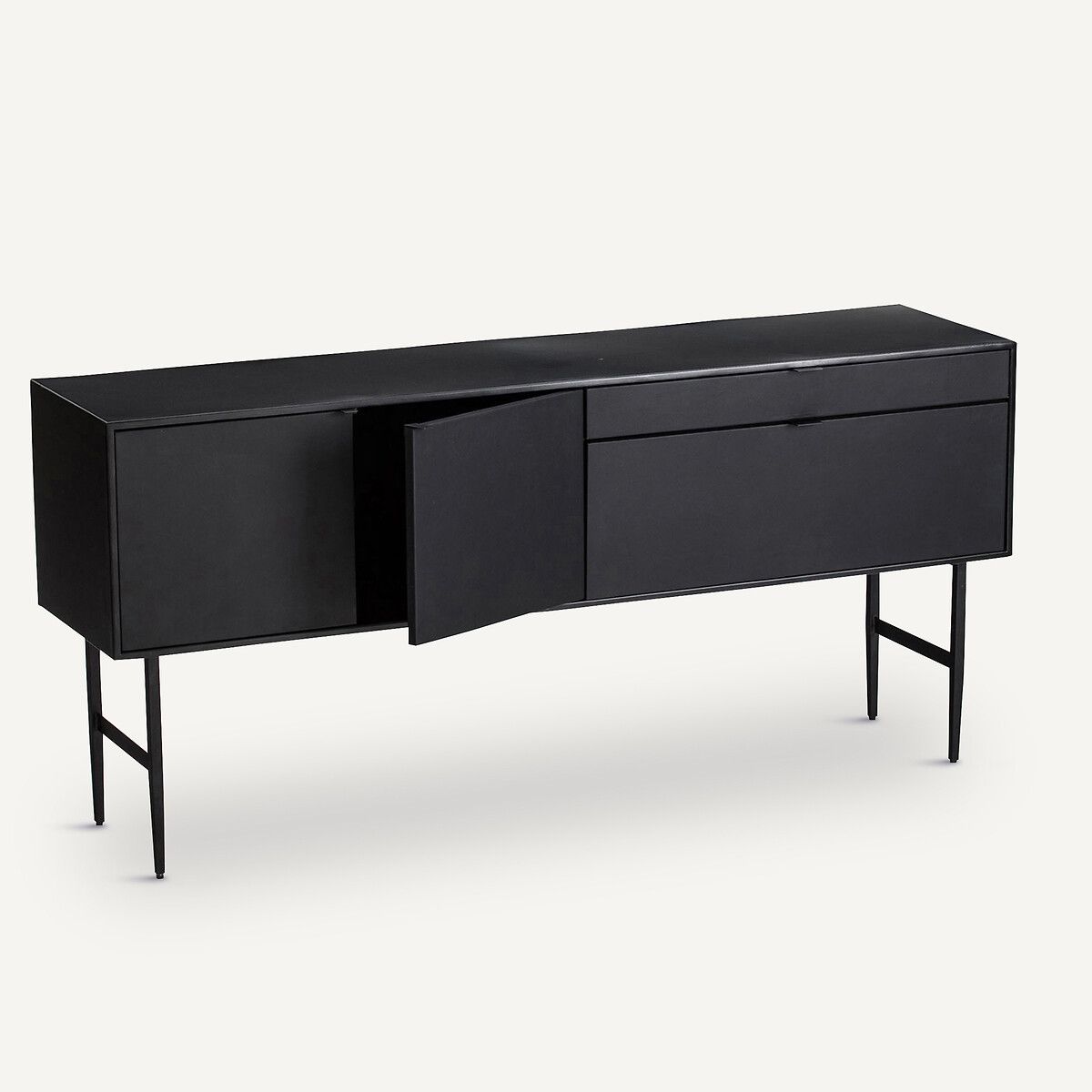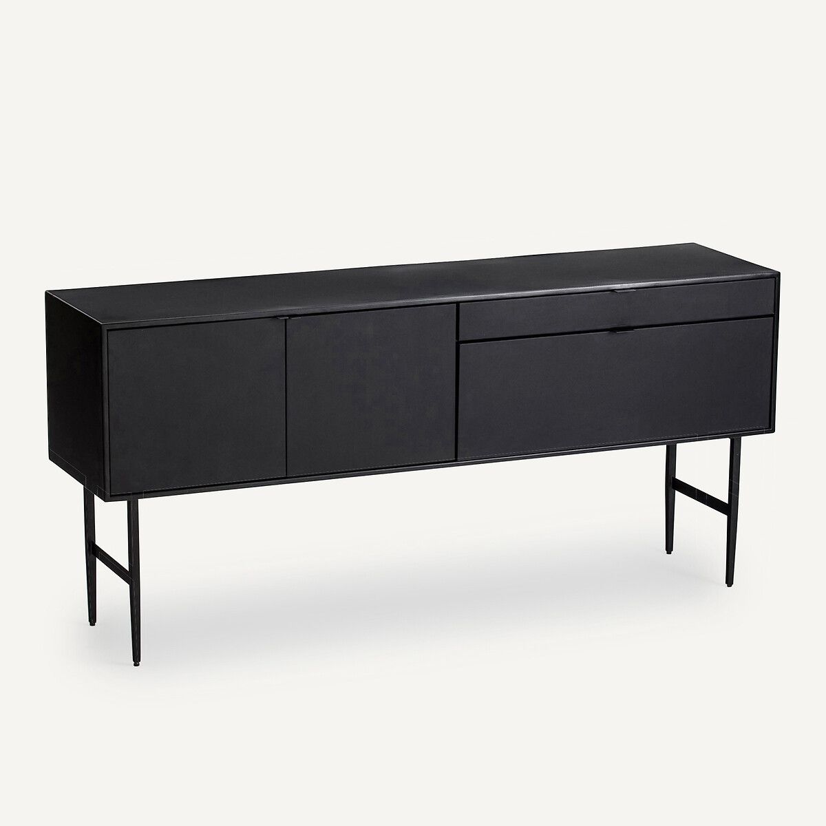 Этот буфет выполнен в стиле минимализма с использованием металла и натуральной воловьей кожи. Чёрный оттенок придаёт интерьеру контрастность и делает его более выразительным.