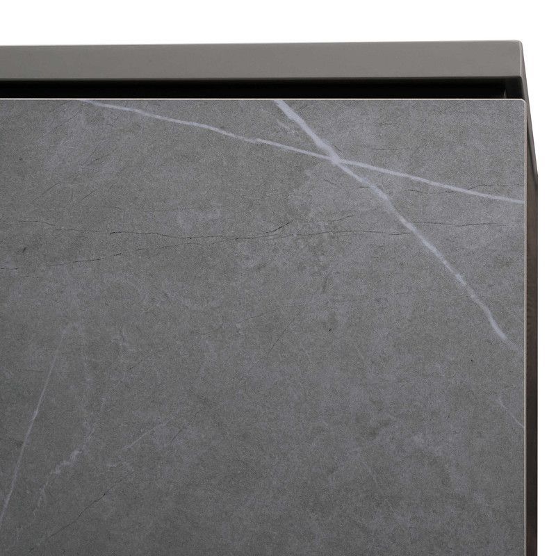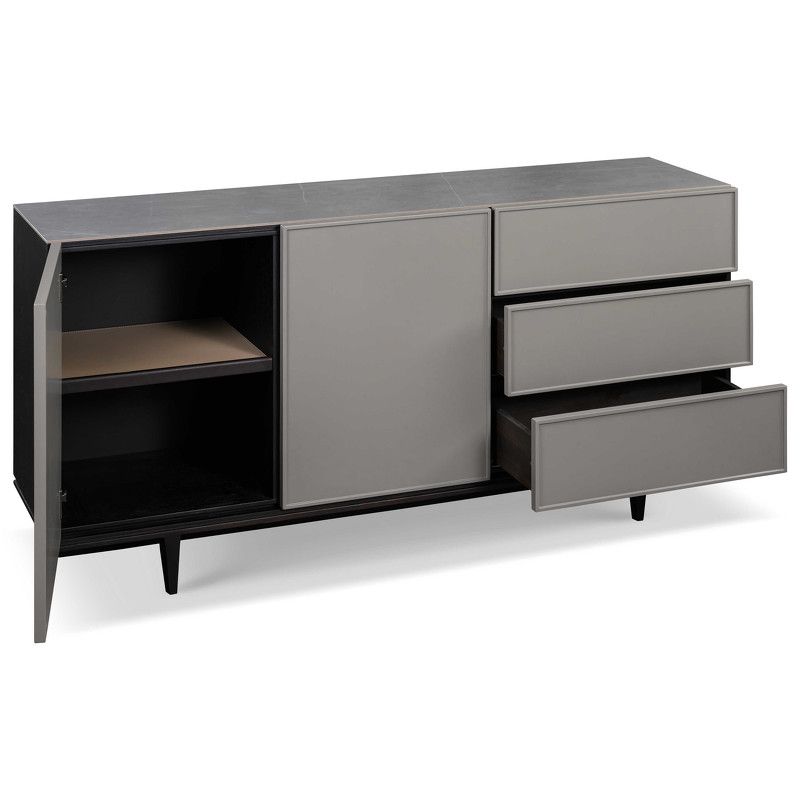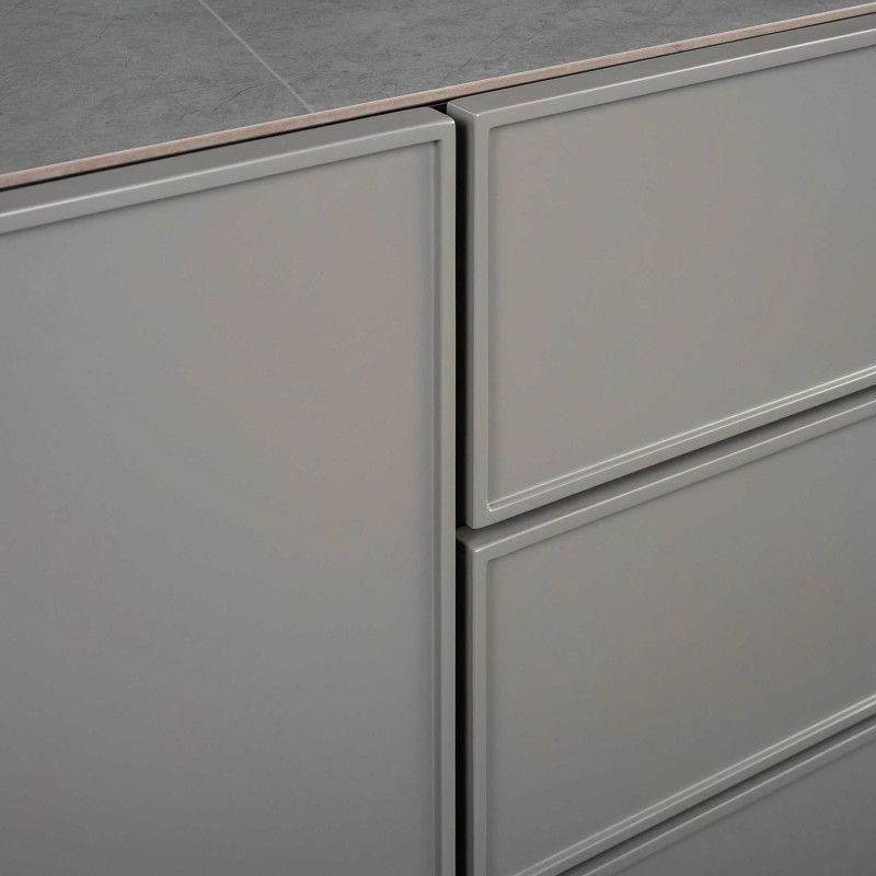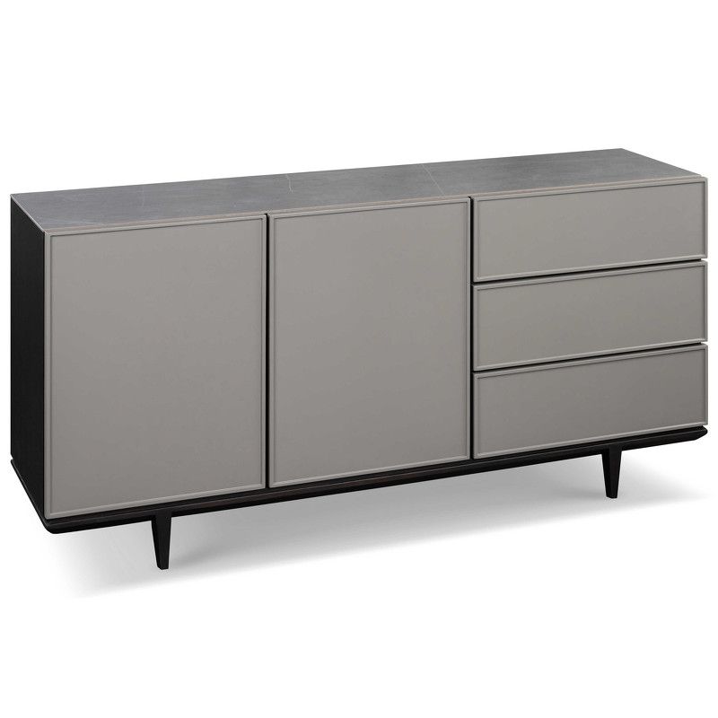 Стильный буфет от итальянского бренда Fratelli Barri. Столешница изготовлена из искусственного камня под серый мрамор, корпус в шпоне дымчатого дуба, фасады ящиков в отделке серым матовым лаком. Ножки изготовлены из массива ясеня.