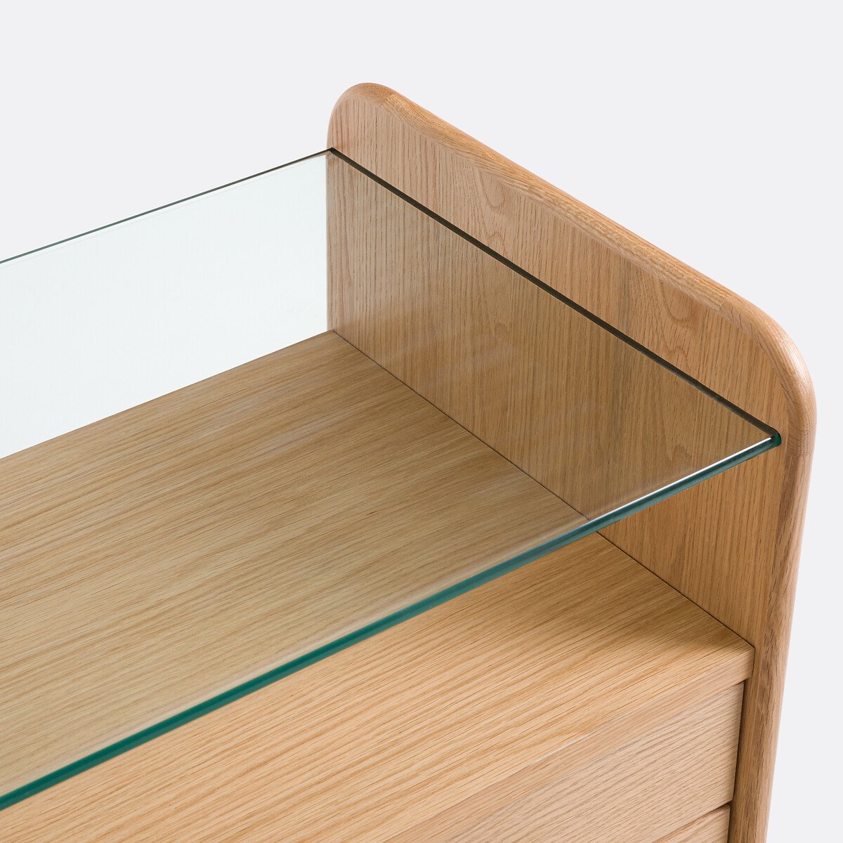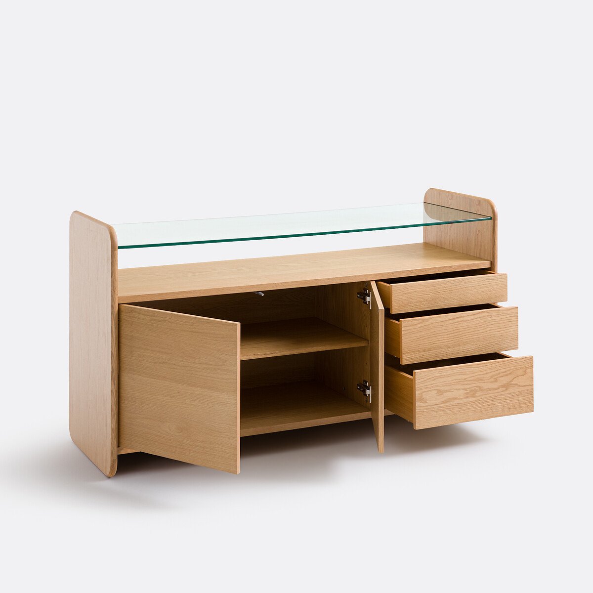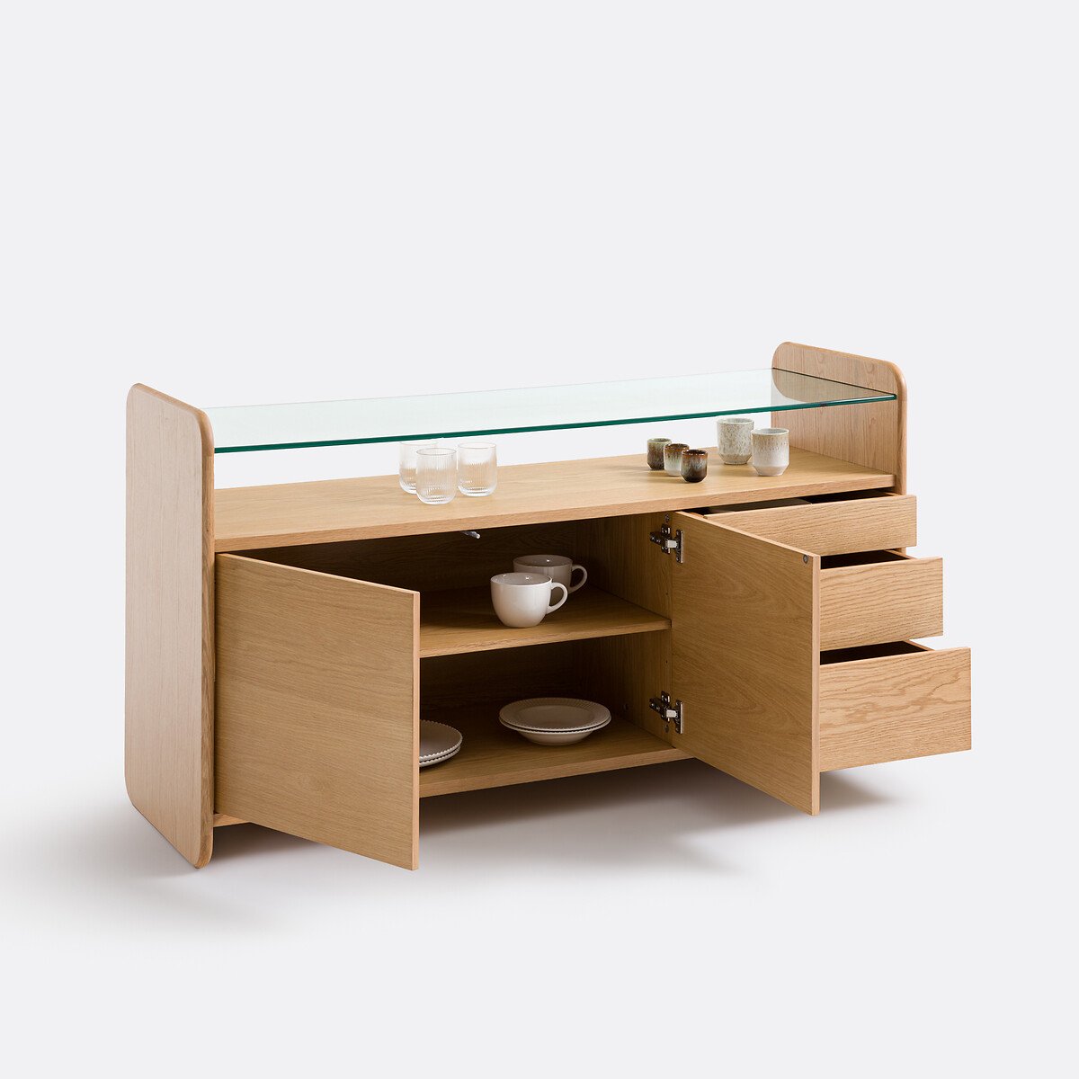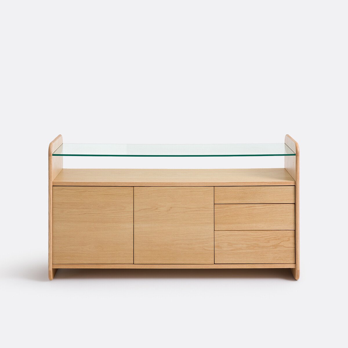 Прямые линии. Конструктор. Смесь материалов. Буфет Ericson / Эриксон вдохновлен модернизмом 70-х годов. Сделанный из шпона дуба и закаленного стекла, он станет стильным дополнением к вашей гостиной. Творение La Redoute Intérieurs.Описание • Верхняя полка из закаленного стекла • Каркас из МДФ, шпонированной дубом, покрытие ПУ-лаком • 2 дверцы с системой push/pull, открывающиеся на 2 полки, 1 из которых регулируется по высоте • 3 выдвижных ящика с системой push/pull (нажатие/открытие) • Количество человек, рекомендованное для сборки: дваКачество • Этот буфет изготовлен с использованием закаленного стекла для вашей безопасности. • Система открывания push/pull: легкое нажатие на дверцу позволяет открыть или закрыть ее без ручки.РазмерыОбщие размеры • Ширина: 141 см • Высота: 79 см • Глубина: 47,5 см • Вес: 72,7 кгВнутренние размеры • Верхняя столешница : Д136,5 x Г45 см • Ниша снаружи: Д136,5 x В14,8 x Г45 см • Внутренняя ниша: Д89,3 x В21,6 x Г41 см • Ящик: Д41,7 x В5,9 x Г34 см • Ящик: Д41,7 x В9,9 x Г34 см • Ящик: Д41,7 x В12,9 x Г34 см • Самостоятельная сборка. • ДРЕВЕСИНА ИЗ УСТОЙЧИВО УПРАВЛЯЕМЫХ ЛЕСОВ. Наличие знака FSC® означает, что древесина, из которой изготовлено изделие, добыта с соблюдением международных стандартов: в процессе добычи не были нарушены права коренных народов, местных жителей и работников, и заготовка велась методом устойчивого лесопользования.Размеры и вес упаковкиДве упаковки • Д99 x В21 x Г57 см, 38 кг • Д154 x В15 x Г62 см, 43 кг