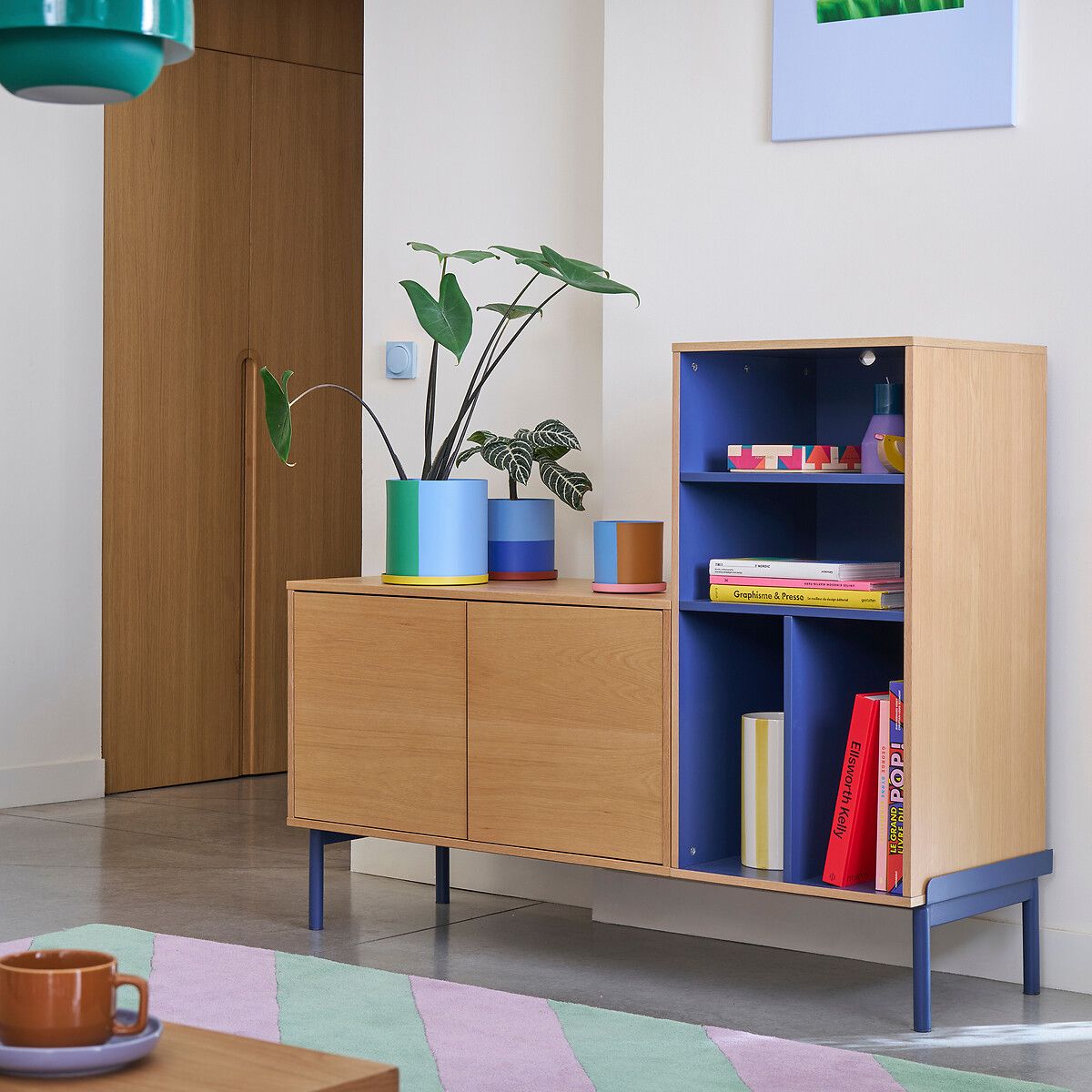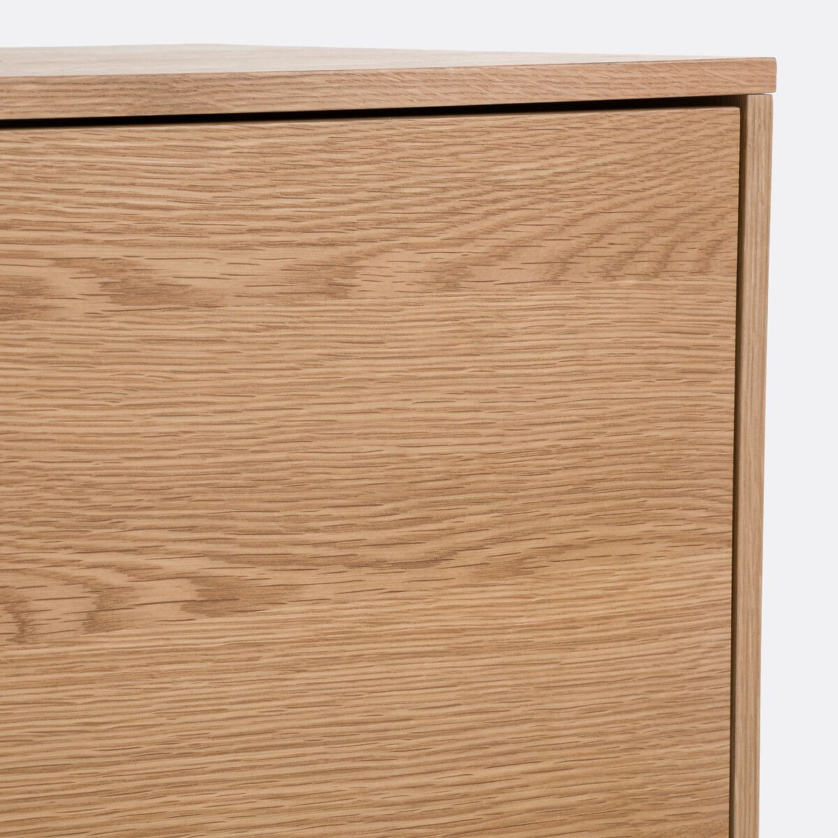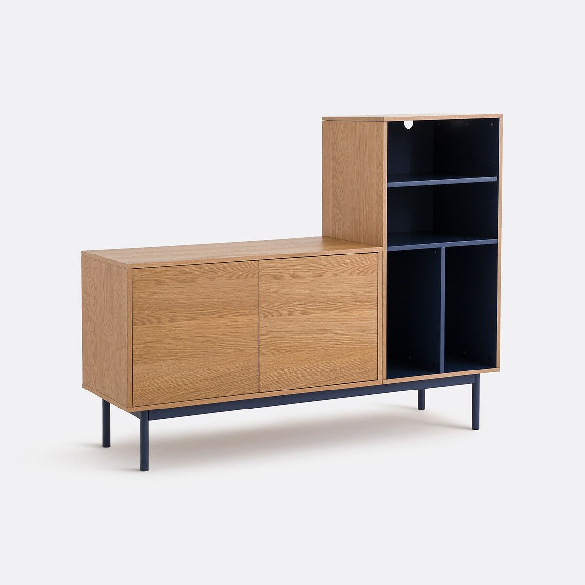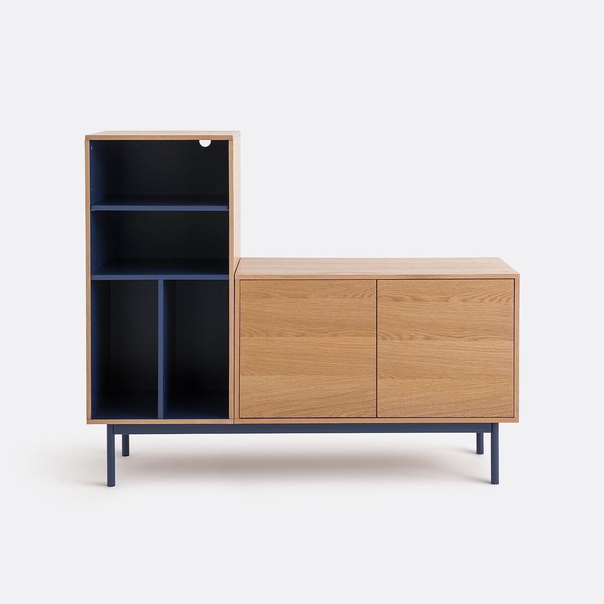 Модуль выполнен из МДФ, шпонированной дубом, с сертификатом FSC® и покрыт НЦ-лаком. Низкий ящик оснащен двумя дверцами с системой мягкого закрытия (soft closing) и регулируемой по высоте полкой внутри. Высокий ящик имеет четыре фиксированные полки из МДФ с синим покрытием. Ножки изготовлены из железа с порошковым покрытием. В верхнем отверстии вертикального ящика предусмотрено место для кабеля. Пластиковые накладки защищают пол от повреждений. Рекомендовано участие двух человек при сборке.