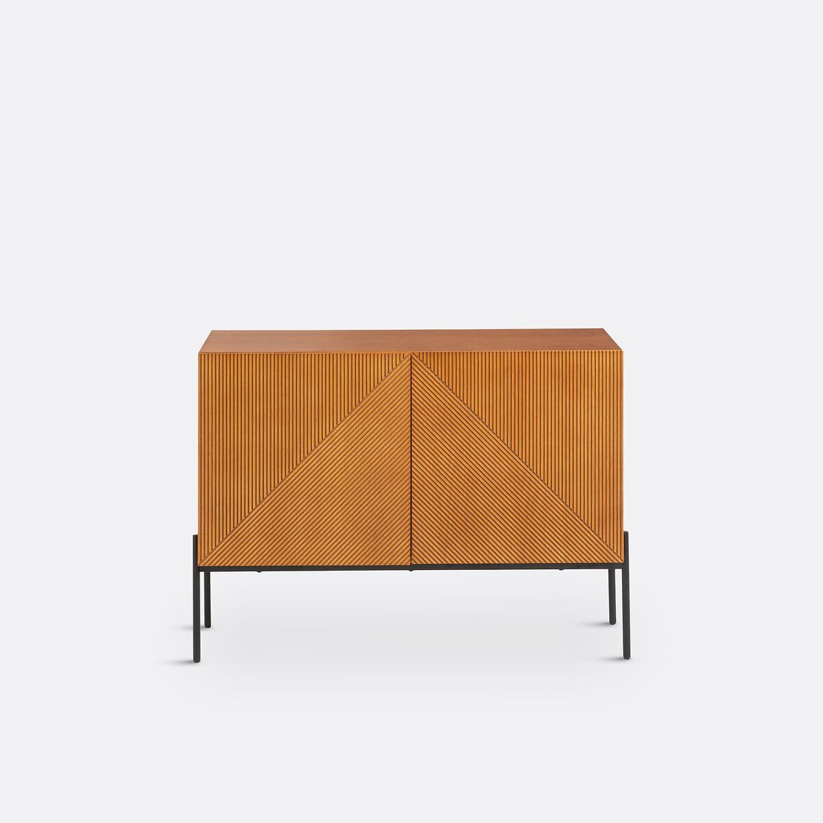 Предварительно собранный ящик из МДФ шпон дуба с НЦ-лакировкой. Дверки из фанеры из дуба (толщина 6 мм). 2 дверки и 1 центральная перегородка. 2 съемные и регулируемые полки, 4 ниши. Шарниры дверок Softclosing для мягкого закрывания. Скошенный вырез сверху для более простого открывания дверок. Регулируемые ножки из металла, эпоксидное покрытие с накладками из пластика.