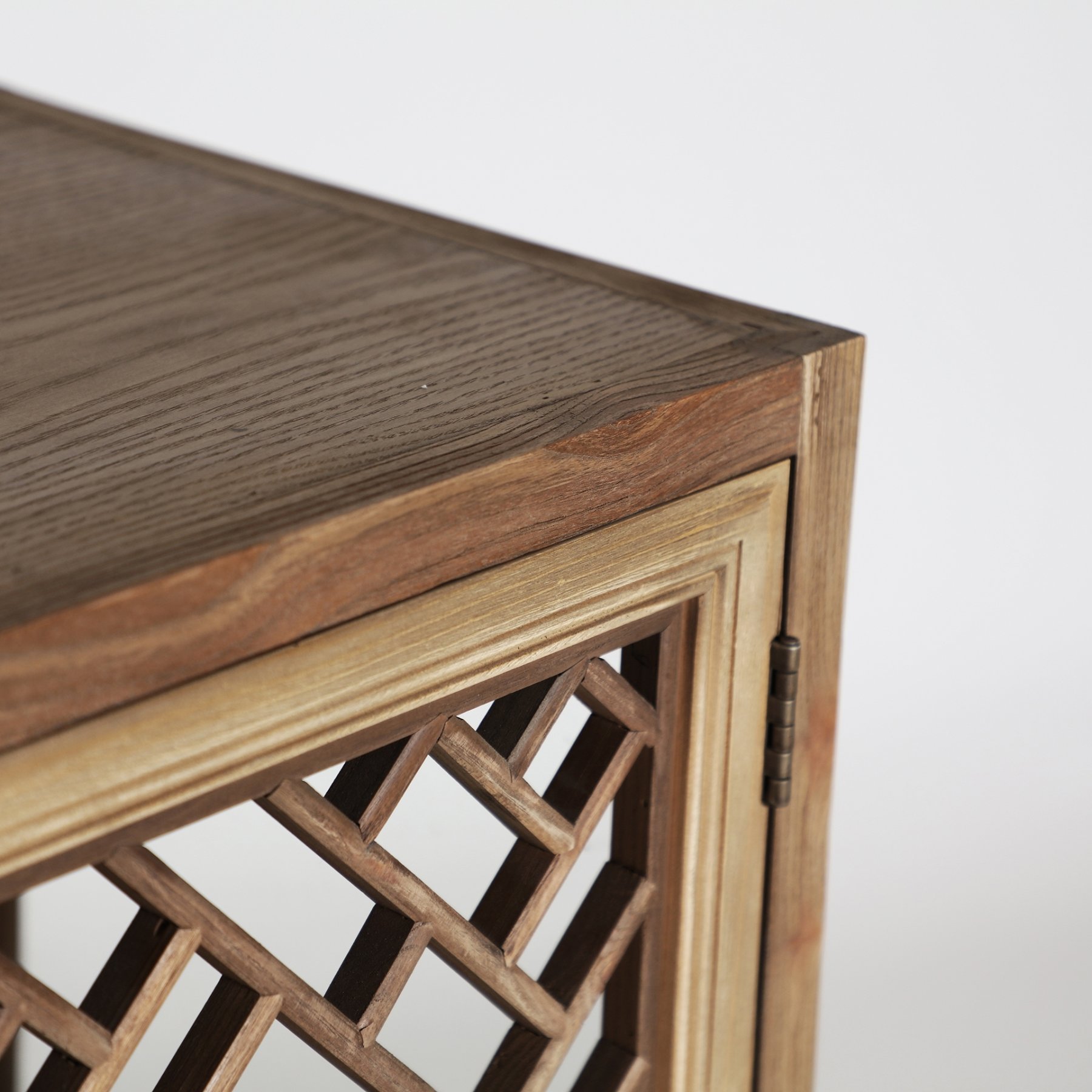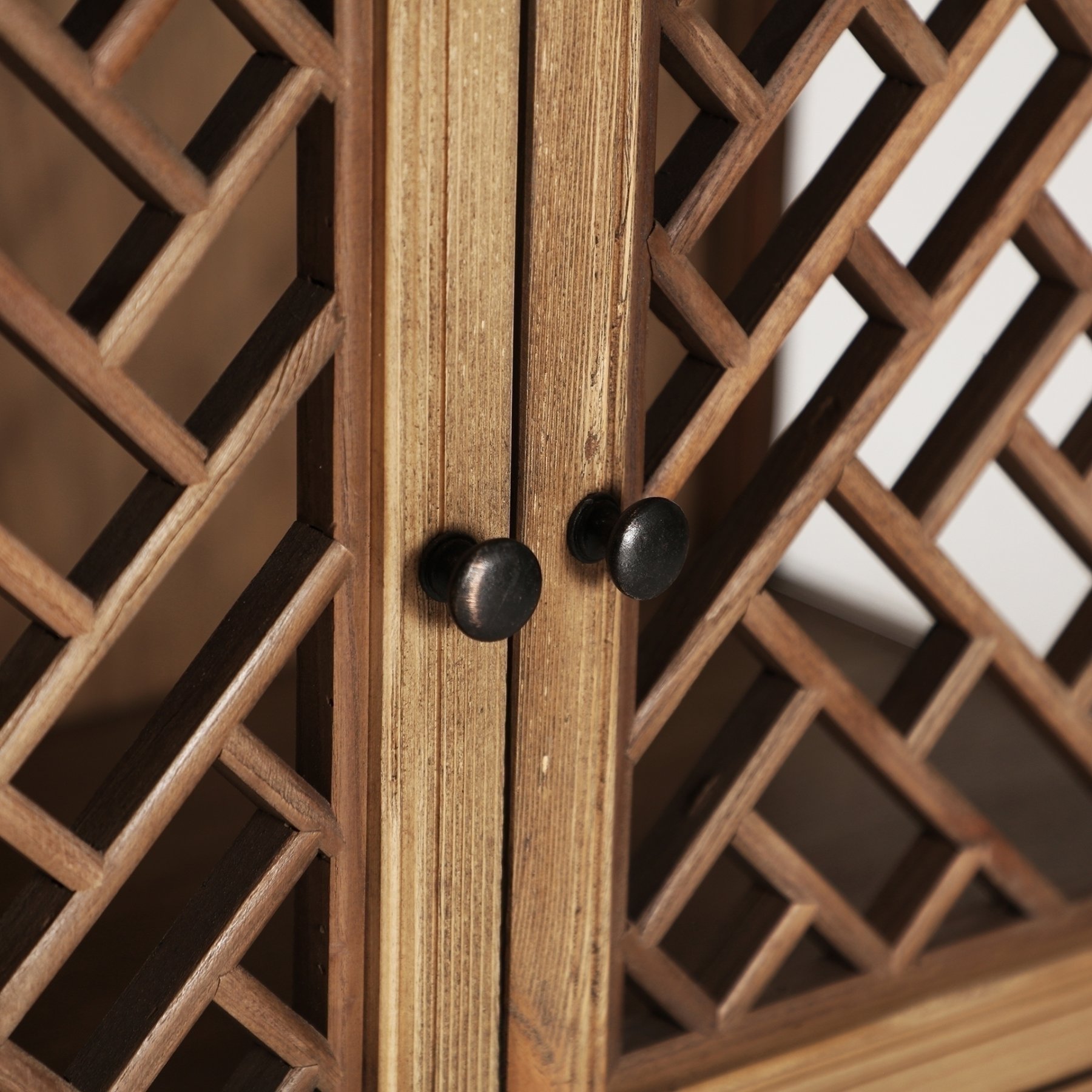 Модульная витрина натурального коричневого цвета в колониальном стиле. Изготовлен из древесины вяза в сочетании со стеклом.