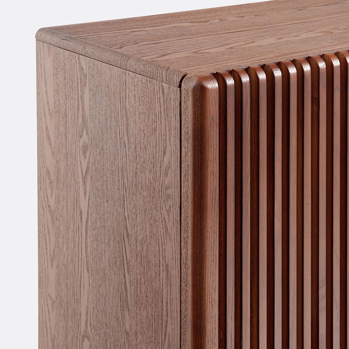 Корпус, дверцы и полки из МДФ, шпонированного ясенем и покрытого нитроцеллюлозным лаком цвета грецкого ореха. Рейки и ножки из массива ясеня, покрытого нитроцеллюлозным лаком цвета грецкого ореха. Три регулируемые внутренние полки и одна фиксированная. Сертифицированная древесина FSC®.