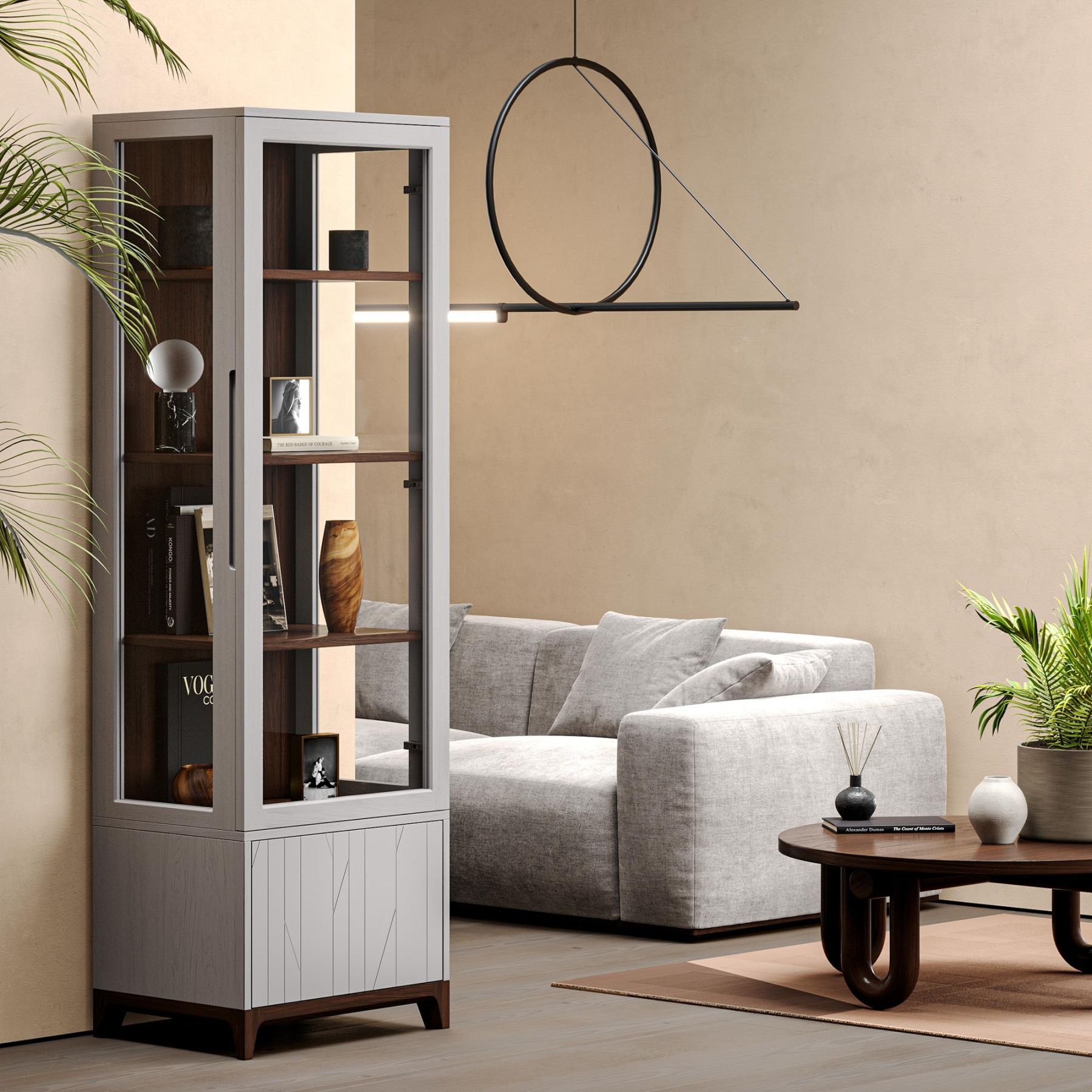 Компактные габариты позволят разместить ее даже в небольших пространствах. Элегантные стеклянные фасады с трех сторон придают легкость конструкции и защищают от пыли хранящиеся в ней предметы. Витрина состоит из четырех секций с полками и выдвижным ящиком, который скрыт за фасадом с авторской гравировкой. Витрину можно использовать как самостоятельно, так и собрать гарнитур из нескольких предметов, формируя завершенный и благородный интерьер.
