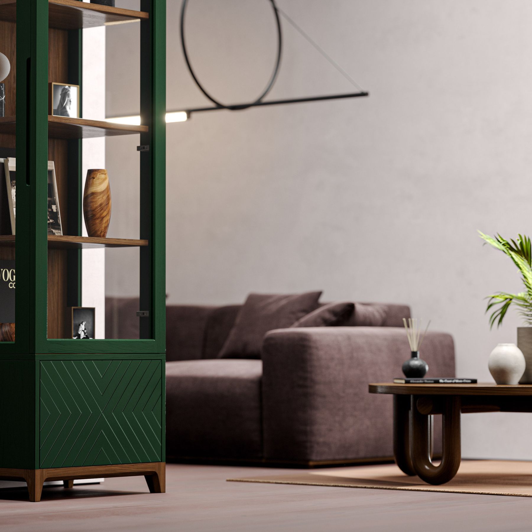 Компактные габариты позволят разместить ее даже в небольших пространствах. Элегантные стеклянные фасады с трех сторон придают легкость конструкции и защищают от пыли хранящиеся в ней предметы. Витрина состоит из четырех секций с полками и выдвижным ящиком, который скрыт за фасадом с авторской гравировкой. Витрину можно использовать как самостоятельно, так и собрать гарнитур из нескольких предметов, формируя завершенный и благородный интерьер.