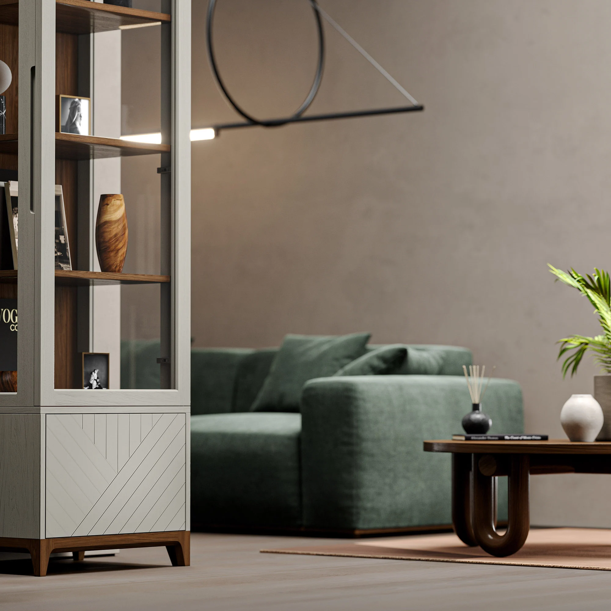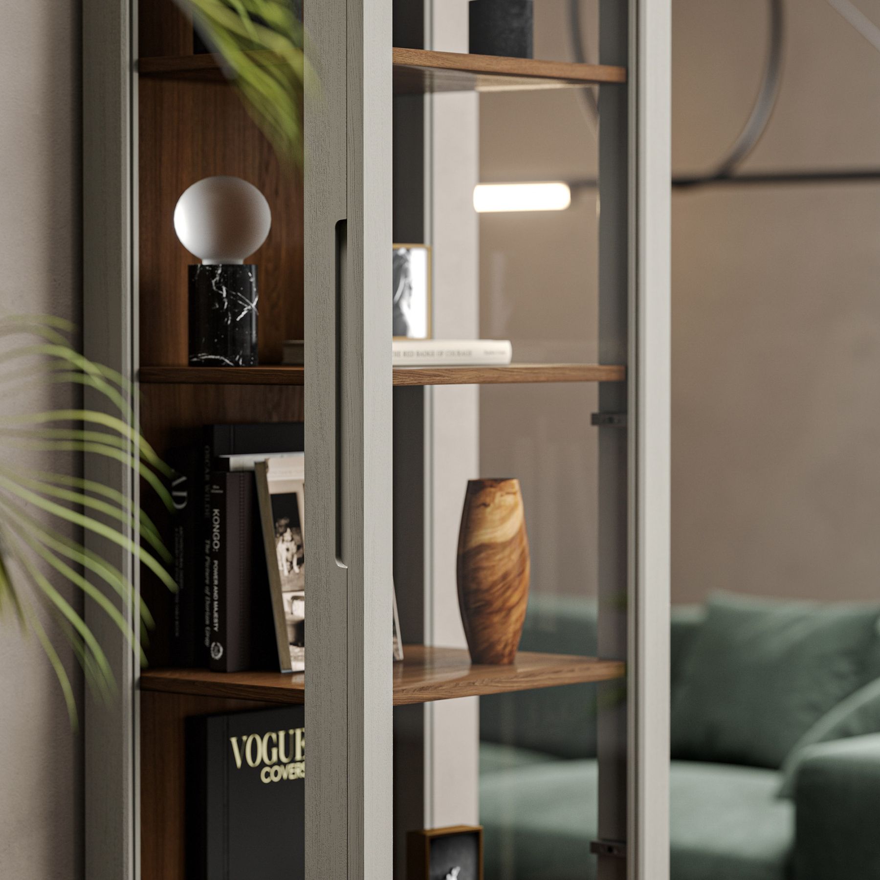 Компактные габариты позволят разместить ее даже в небольших пространствах. Элегантные стеклянные фасады с трех сторон придают легкость конструкции и защищают от пыли хранящиеся в ней предметы. Витрина состоит из четырех секций с полками и выдвижным ящиком, который скрыт за фасадом с авторской гравировкой. Витрину можно использовать как самостоятельно, так и собрать гарнитур из нескольких предметов, формируя завершенный и благородный интерьер.