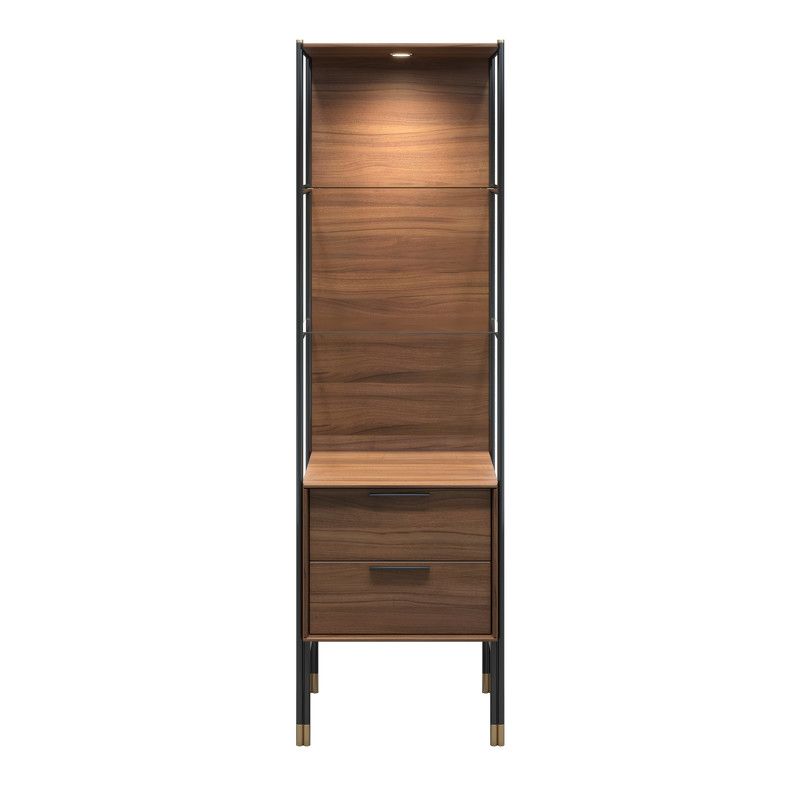 Витрина оснащена двумя выдвижными ящиками, двумя стеклянными полками и подсветкой.