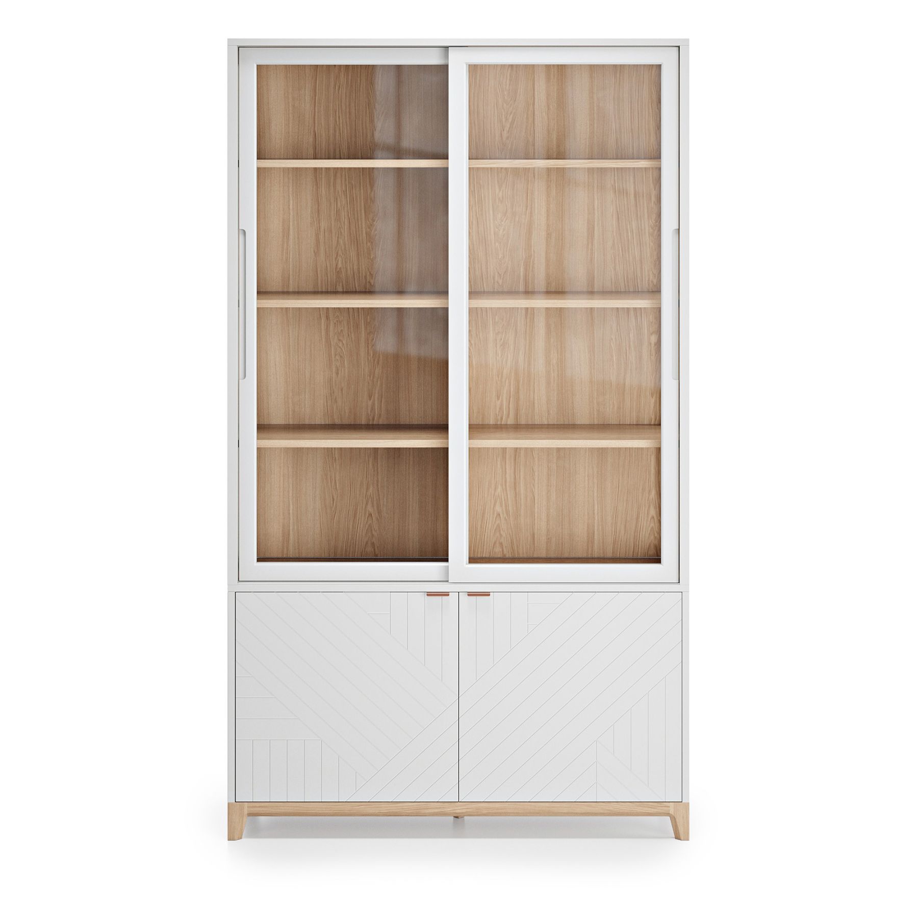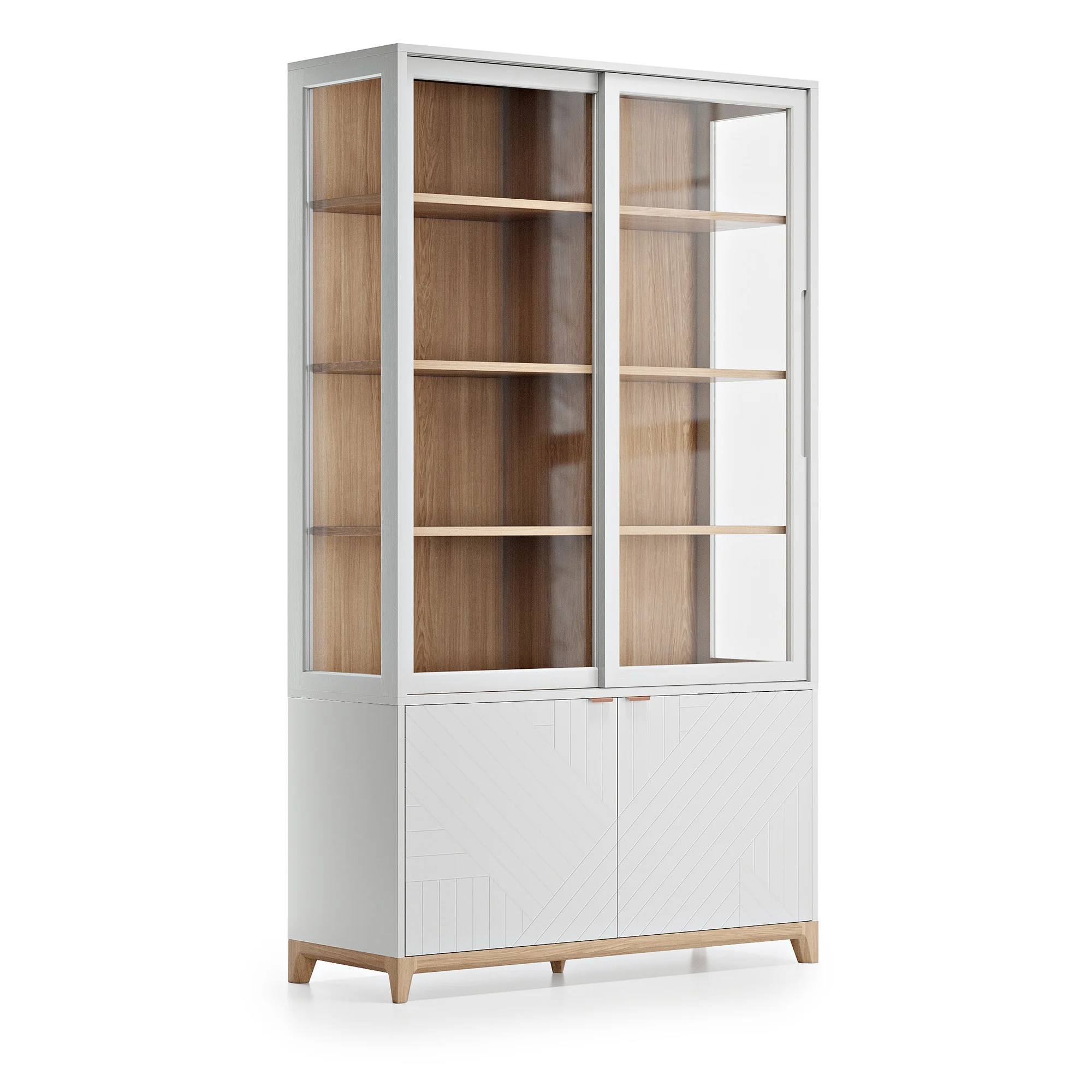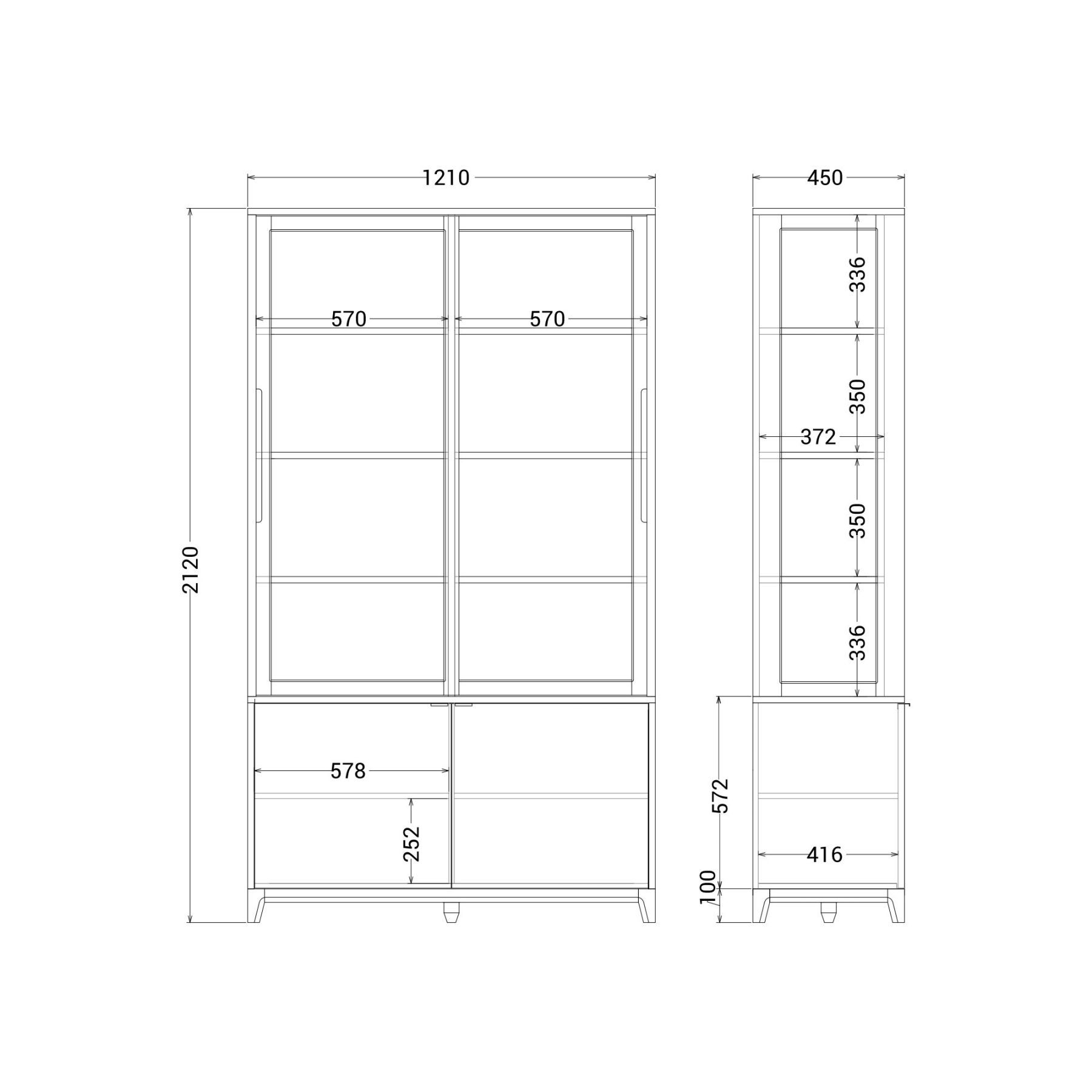 Высокая витрина поможет организовать домашние коллекции, помня о главном — стильном интерьере и комфорте. В нижней секции найдется место для объемных и весомых вещей, а на полках — для праздничного декора, бокалов и книг.