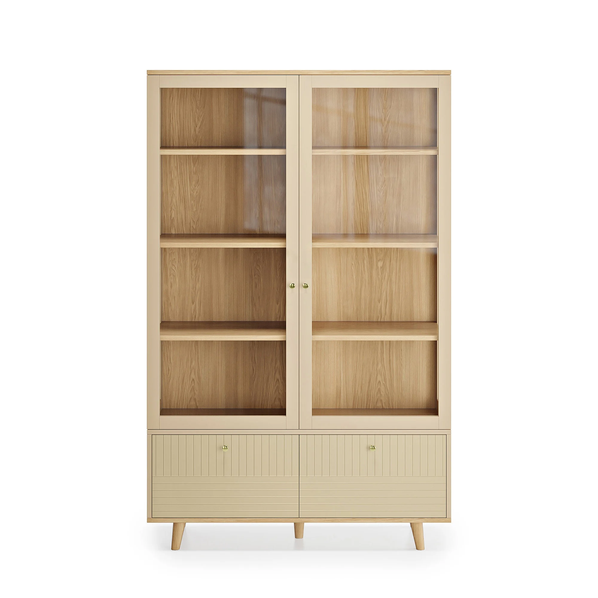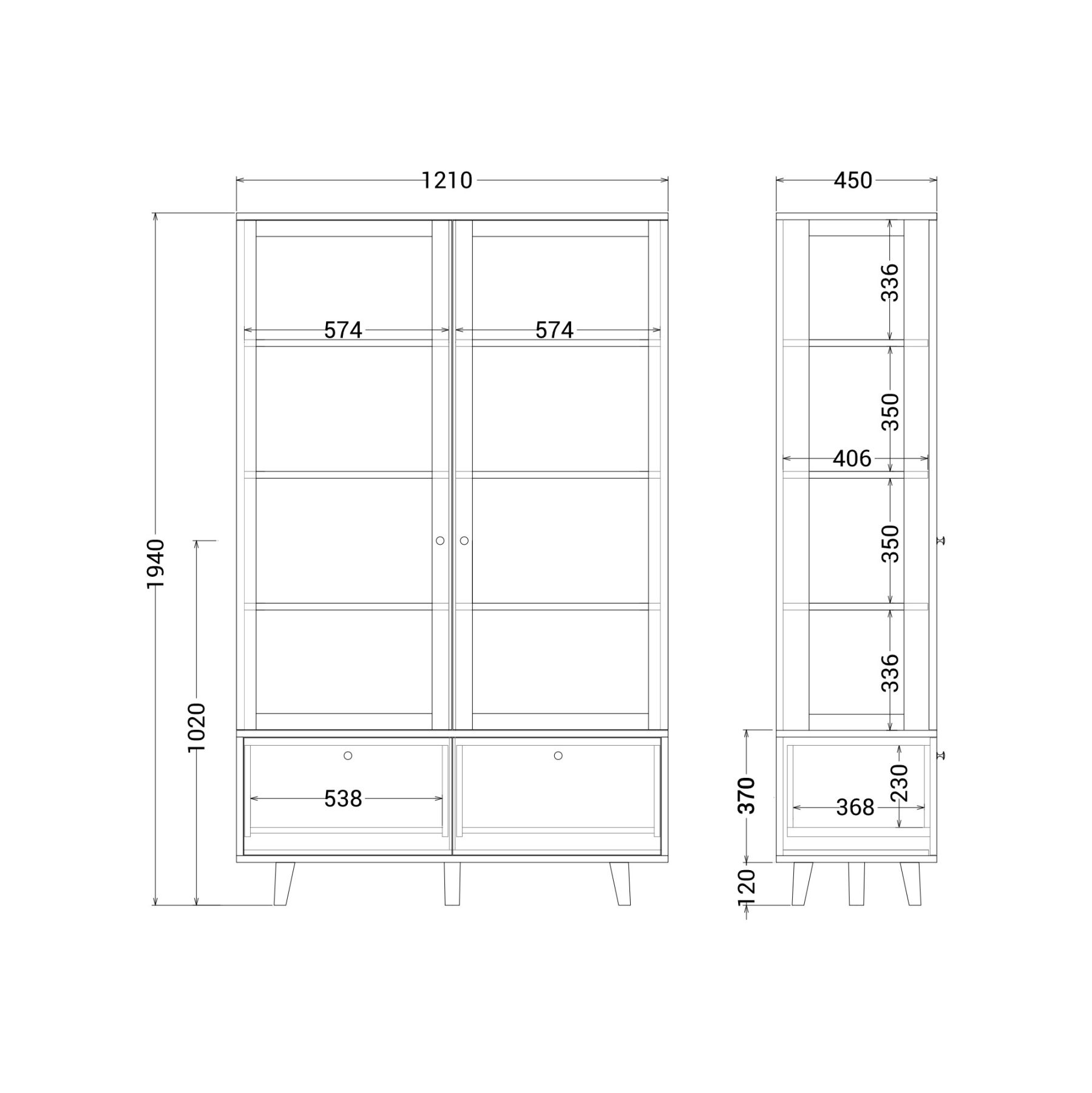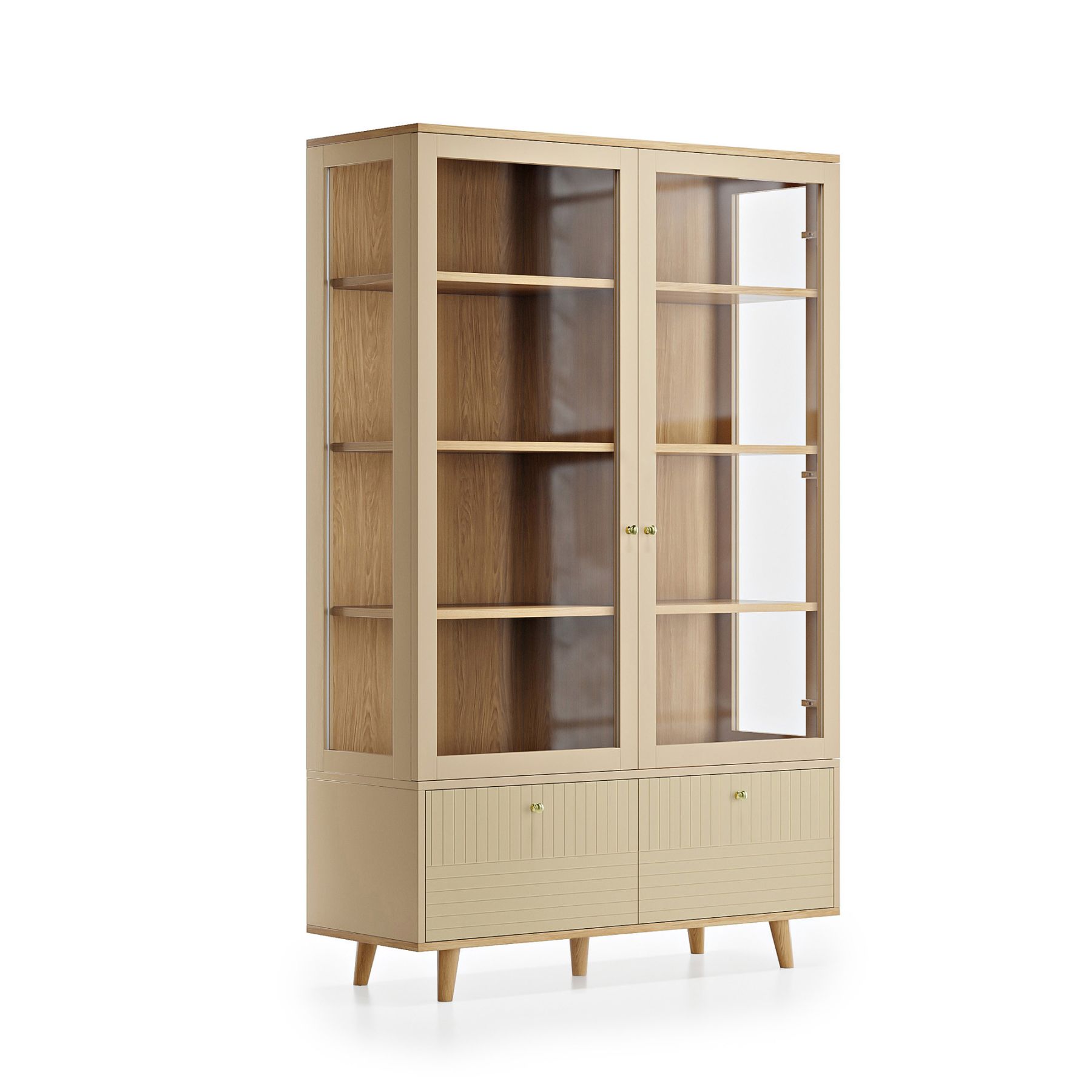 Витрина TWIN с изящными ножками и стеклянными фасадами поможет организовать правильное и комфортное хранение, не забывая о главном — стильном интерьере. Свет, проникая сквозь элегантные стеклянные фасады витрины, выгодно подчеркивает красоту хранящихся в ней предметов. Витрина имеет восемь вместительных полок и два выдвижных ящика. В ящиках найдется место для более габаритных объемных вещей, а на полках — для декора, посуды и книг.