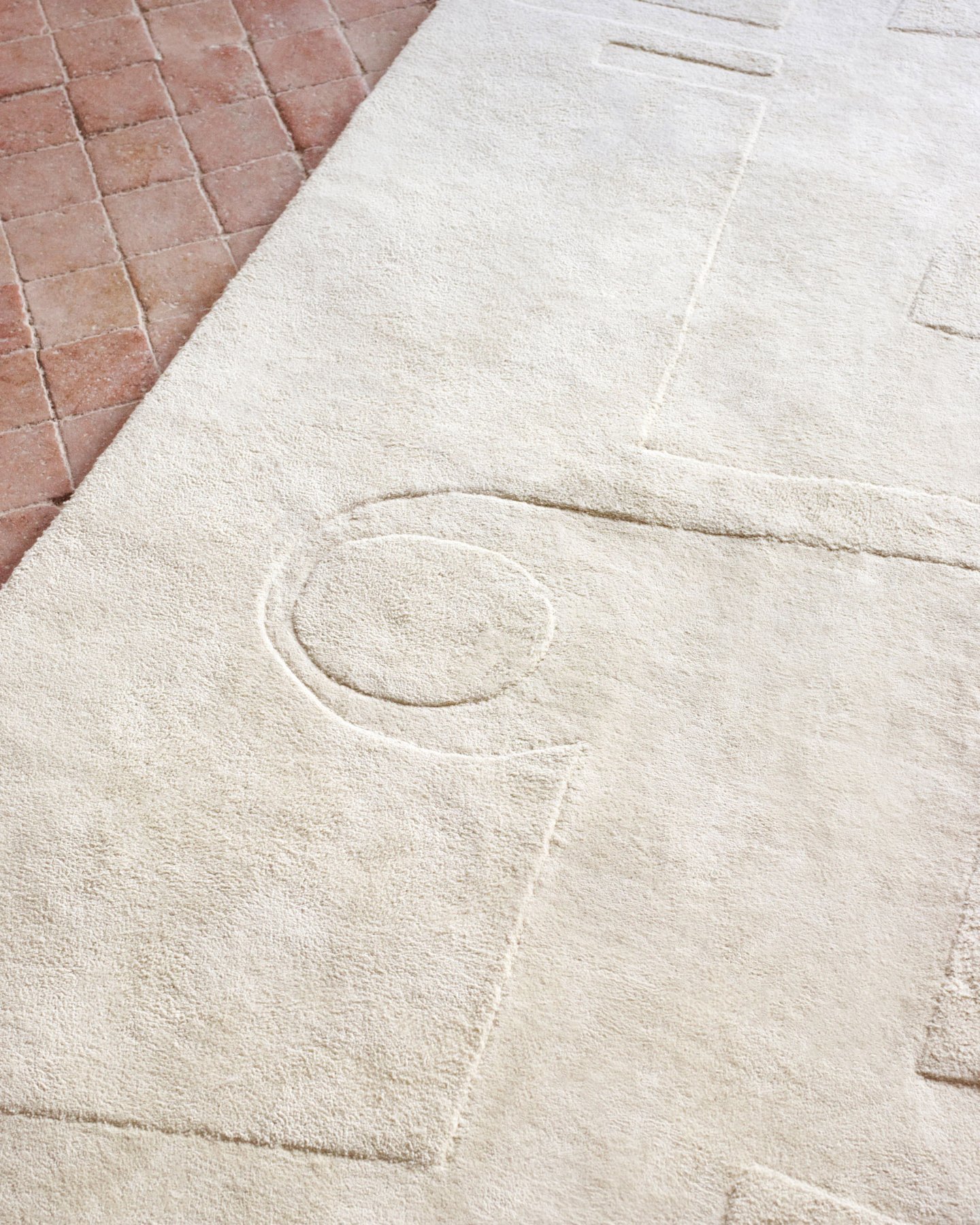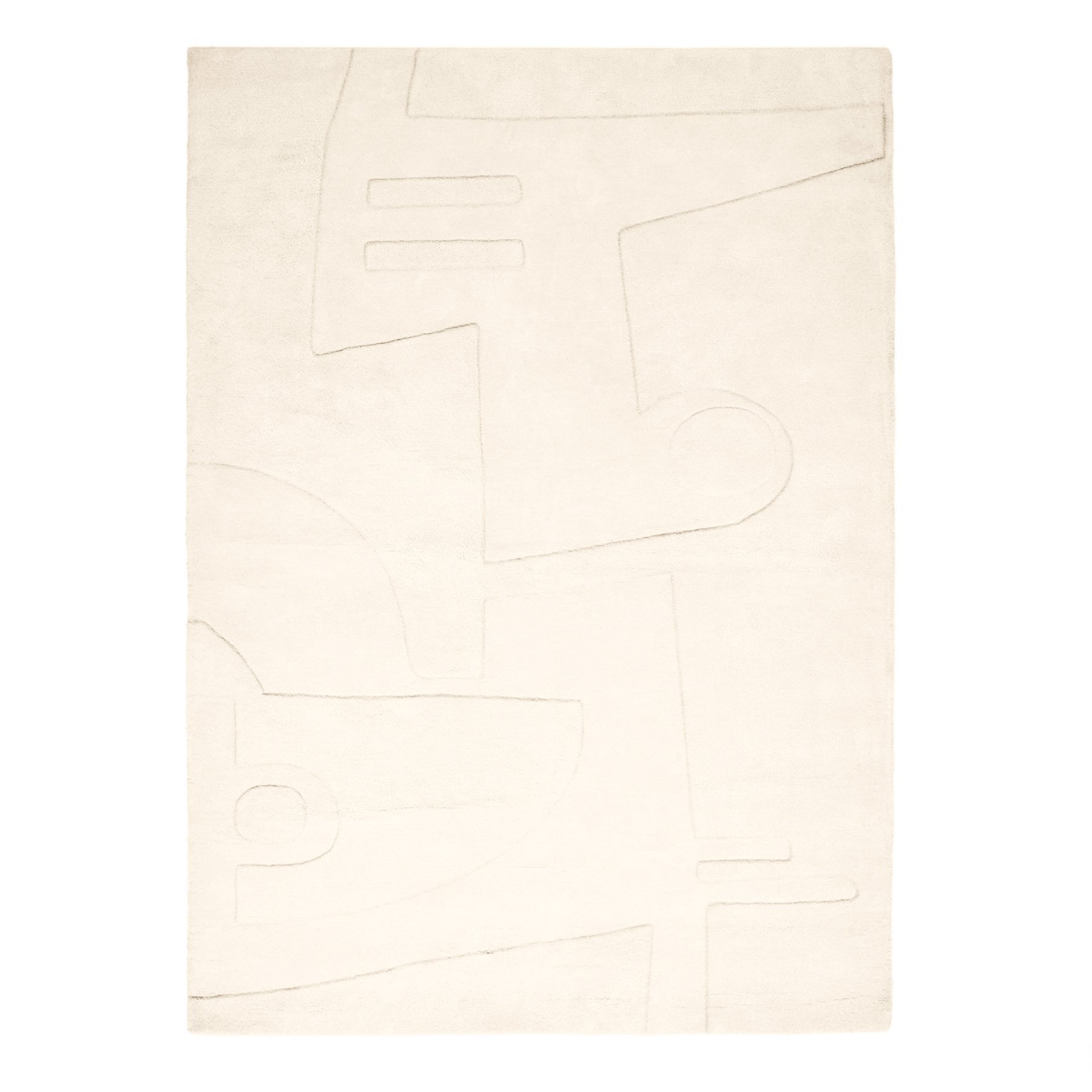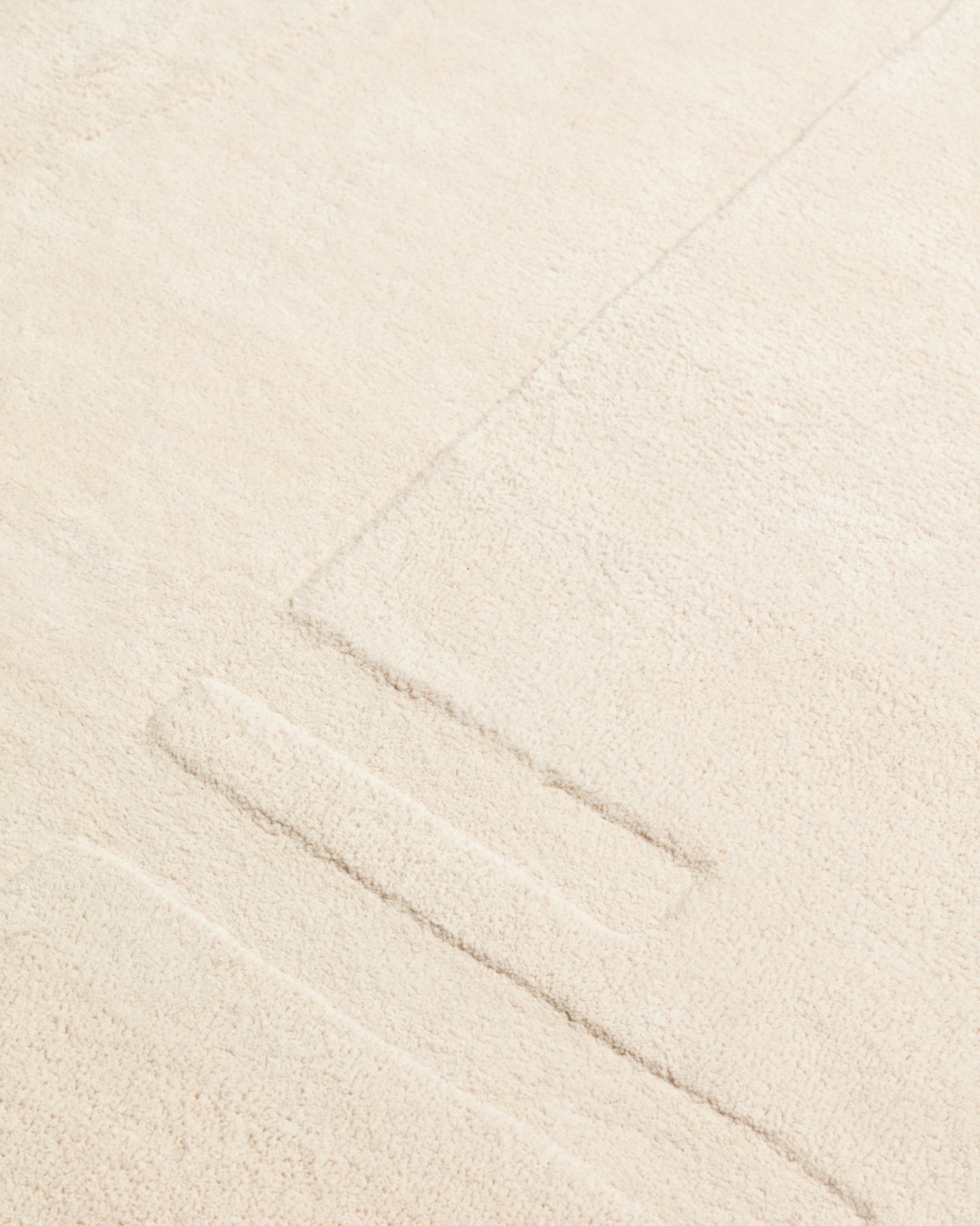Ковер имеет прямоугольную форму. Он изготовлен из 100% белого хлопка. Геометрический рисунок образован разной высотой ворса, что выглядит необычно и современно.