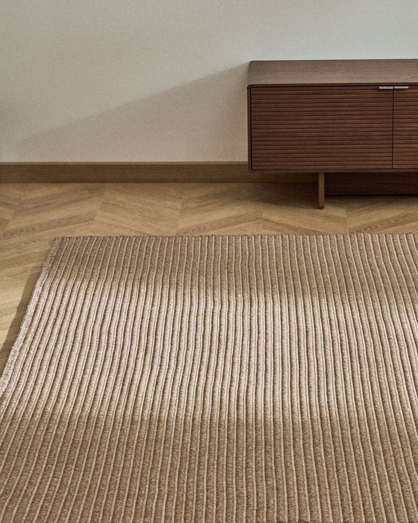 тот ковер ручной работы выделяется уникальностью каждого изделия, что является результатом кропотливой работы. Синтетические волокна, используемые в его изготовлении, обладают превосходной устойчивостью к ежедневному использованию и воздействию уличных температур, что делает его универсальным и долговечным выбором для любой комнаты в доме или на террасе. Кроме того, этот материал облегчает чистку и уход, помогая ковру сохранять свой безупречный вид в течение долгого времени. Ручная работа гарантирует, что каждый ковер уникален,