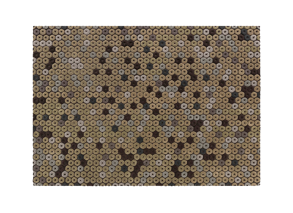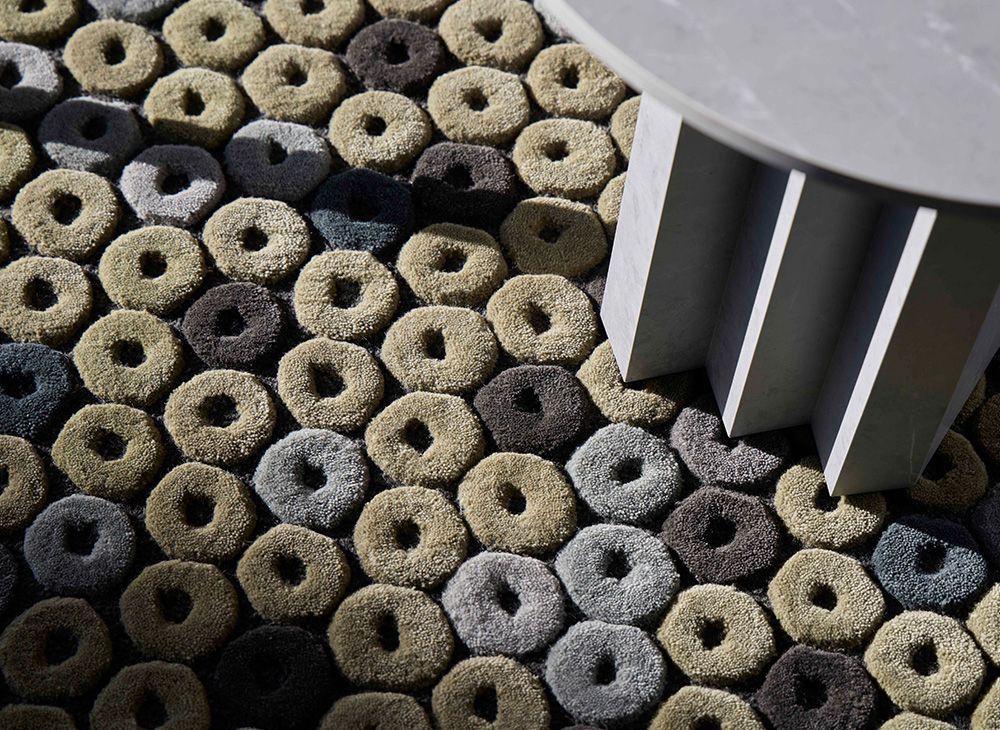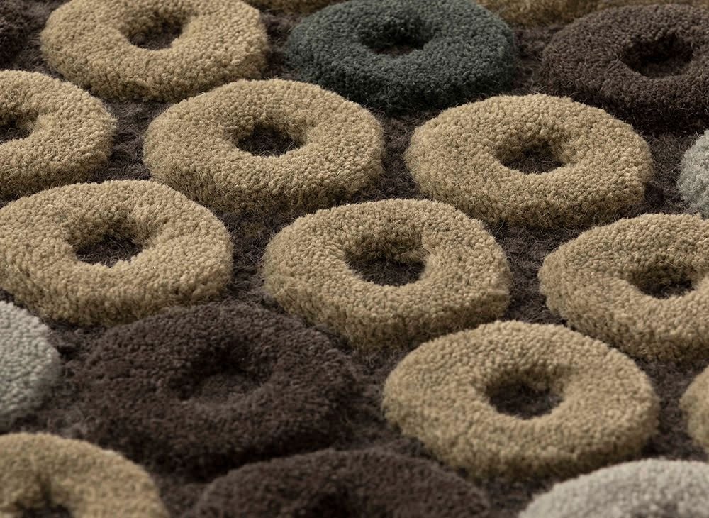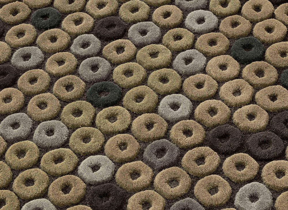 Конфеты с дырочкой: CHIMOS получил свое название от конфет, которые были очень популярны в восьмидесятые, также известных в Америке как Life Savers. В ЧИМОСЕ главным действующим лицом является единственная фигура, диск, повторяющийся в хроматическом склонении своего основного цвета на контрастном фоне. Графическая линия, определяющая каждый диск, приобретает силу благодаря изменениям объема, возникающим в результате кропотливой работы по тафтингу из натуральной шерсти