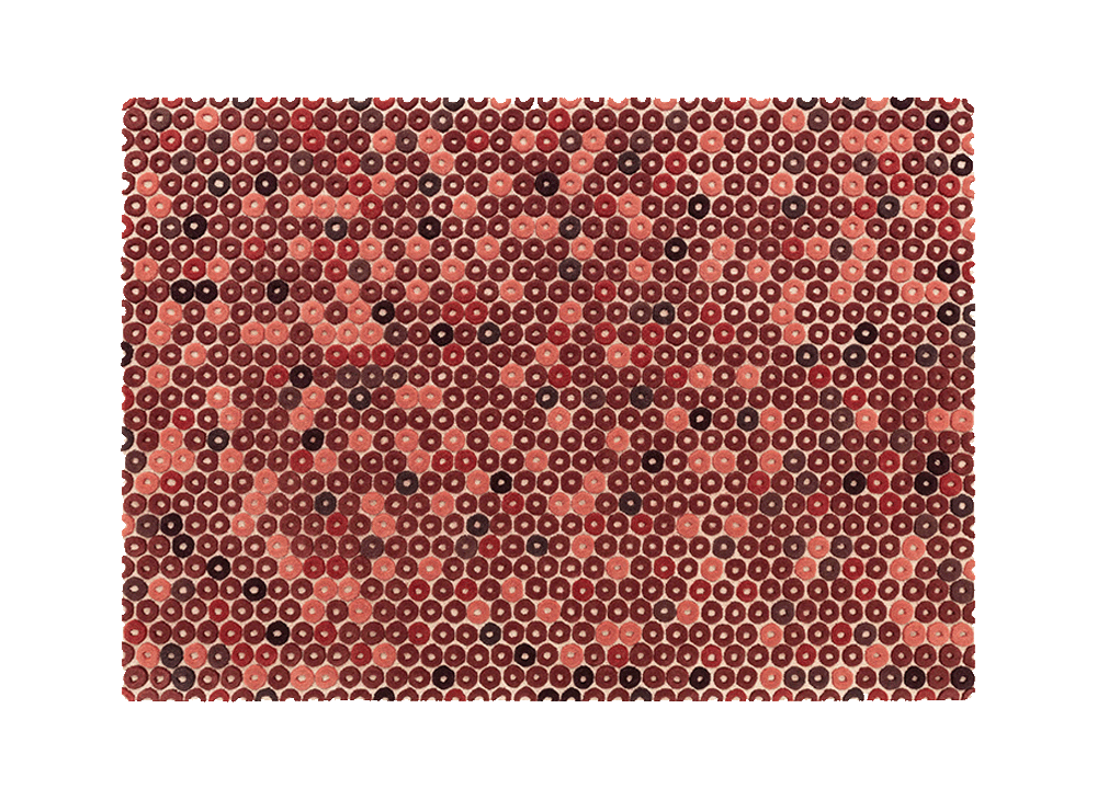 Конфеты с дырочкой: CHIMOS получил свое название от конфет, которые были очень популярны в восьмидесятые, также известных в Америке как Life Savers. В ЧИМОСЕ главным действующим лицом является единственная фигура, диск, повторяющийся в хроматическом склонении своего основного цвета на контрастном фоне. Графическая линия, определяющая каждый диск, приобретает силу благодаря изменениям объема, возникающим в результате кропотливой работы по тафтингу из натуральной шерсти