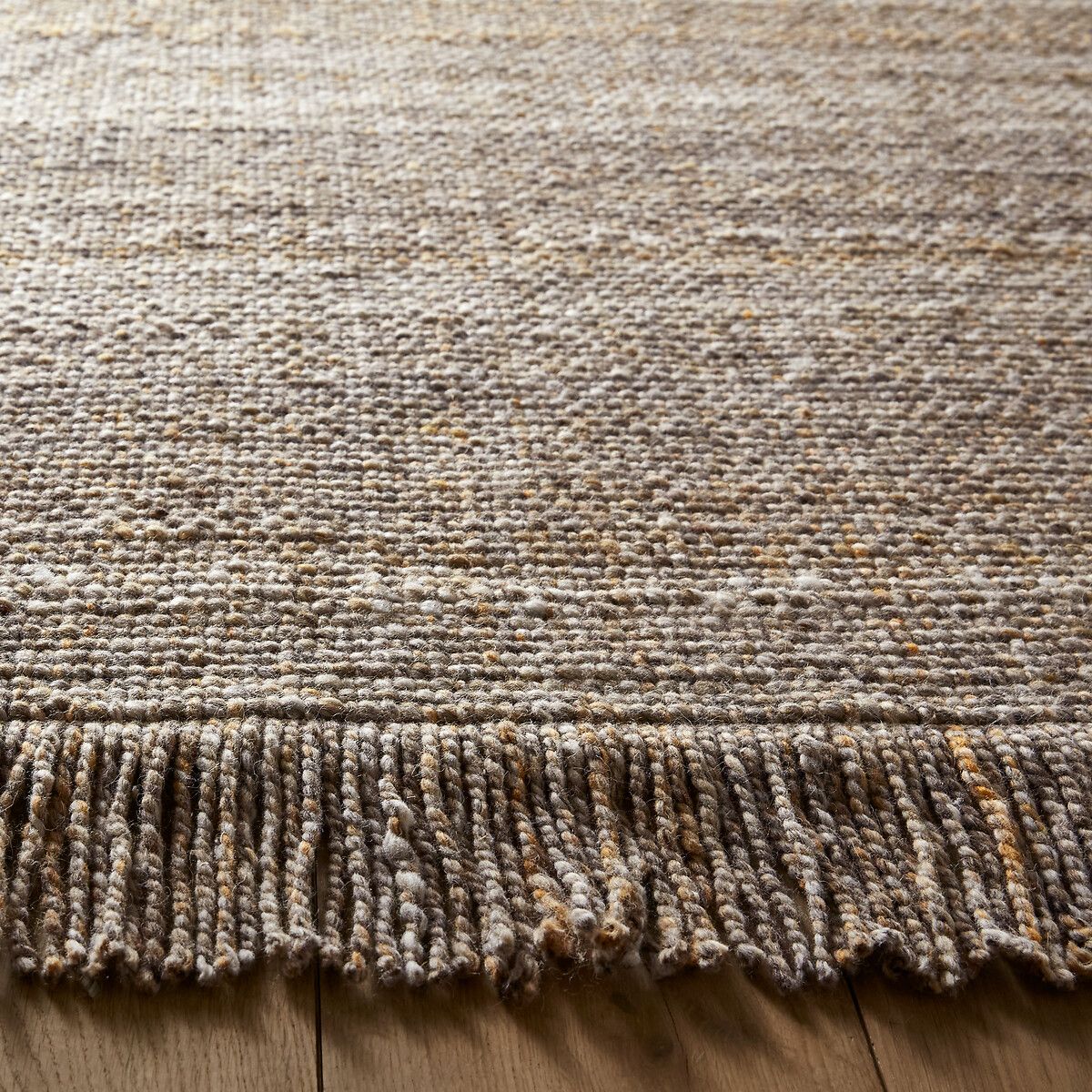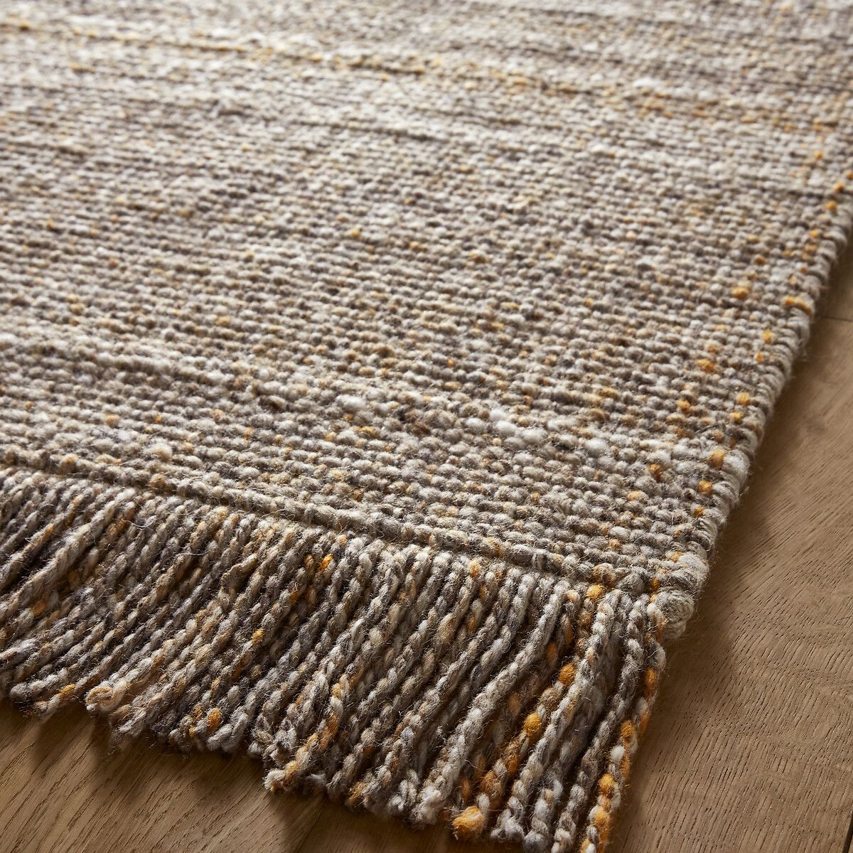 Шерстяной ковер с теплым оттенком. Переплетение охристых и серых волокон создает пестрый эффект с глубокими отблесками. Каждое творение уникально.
