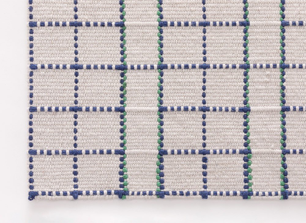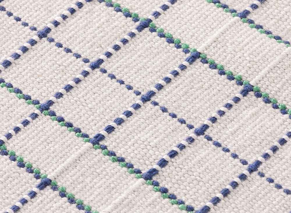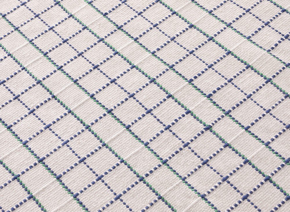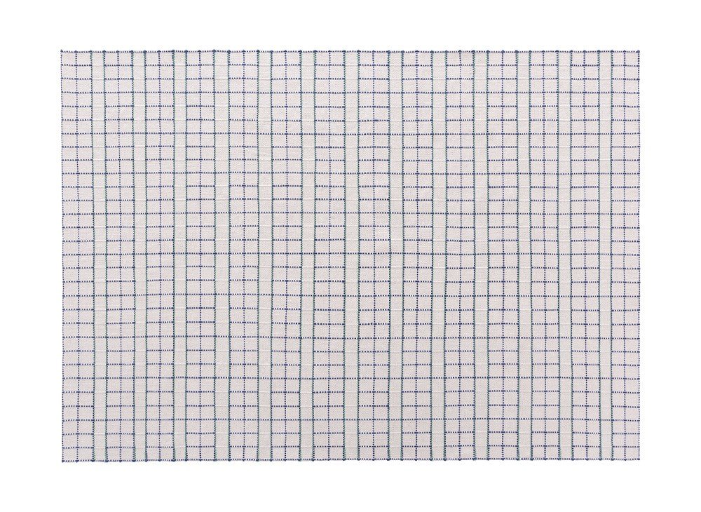 Ковер «Сине-зеленый» из нашей коллекции Reti отличается очень графичным и структурированным узором в виде сетки, созданным студией Terhedebrügge. Этот ковер подходит для использования на открытом воздухе, так как изготовлен из переработанных ПЭТ-волокон зеленых и синих оттенков на белой основе с использованием традиционной техники ручного ткачества.