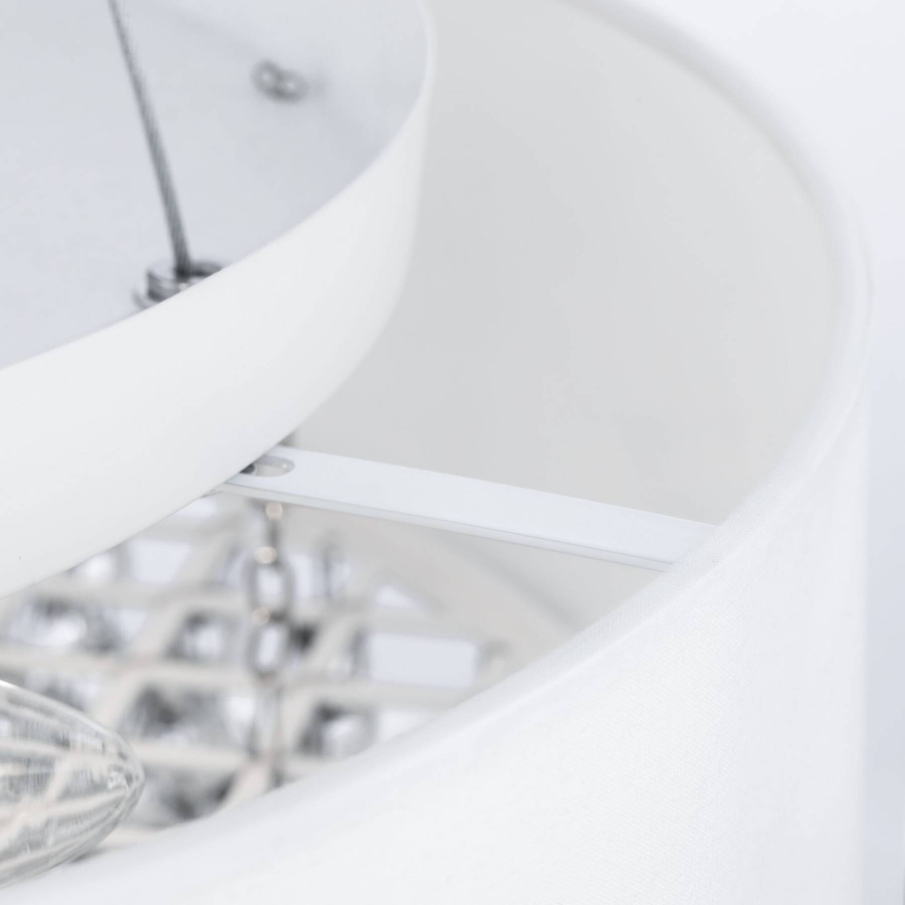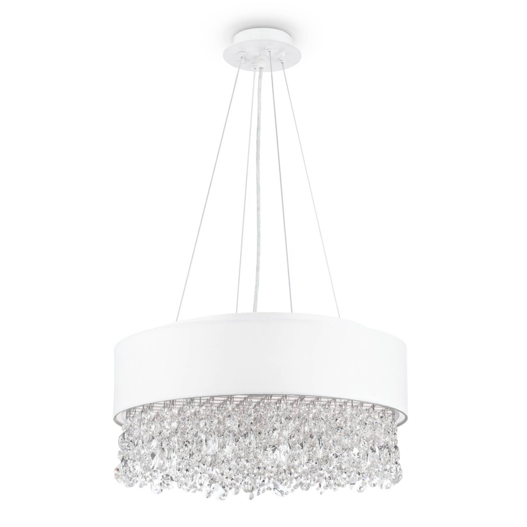 Металлическая арматура в белом цвете. Абажур – ткань, нанесенная на ПВХ, цвет – белый. Декор – подвески в виде граненых кристаллов. Высота подвесных светильников регулируется тросом.